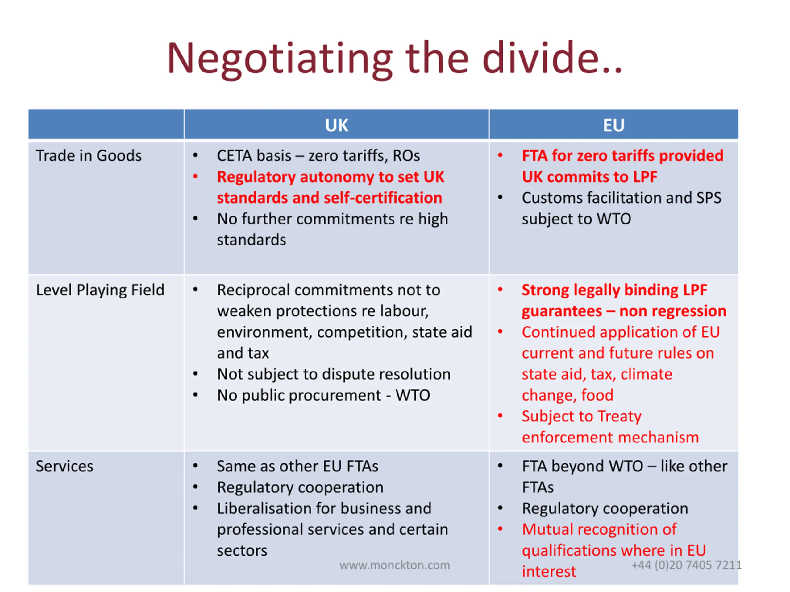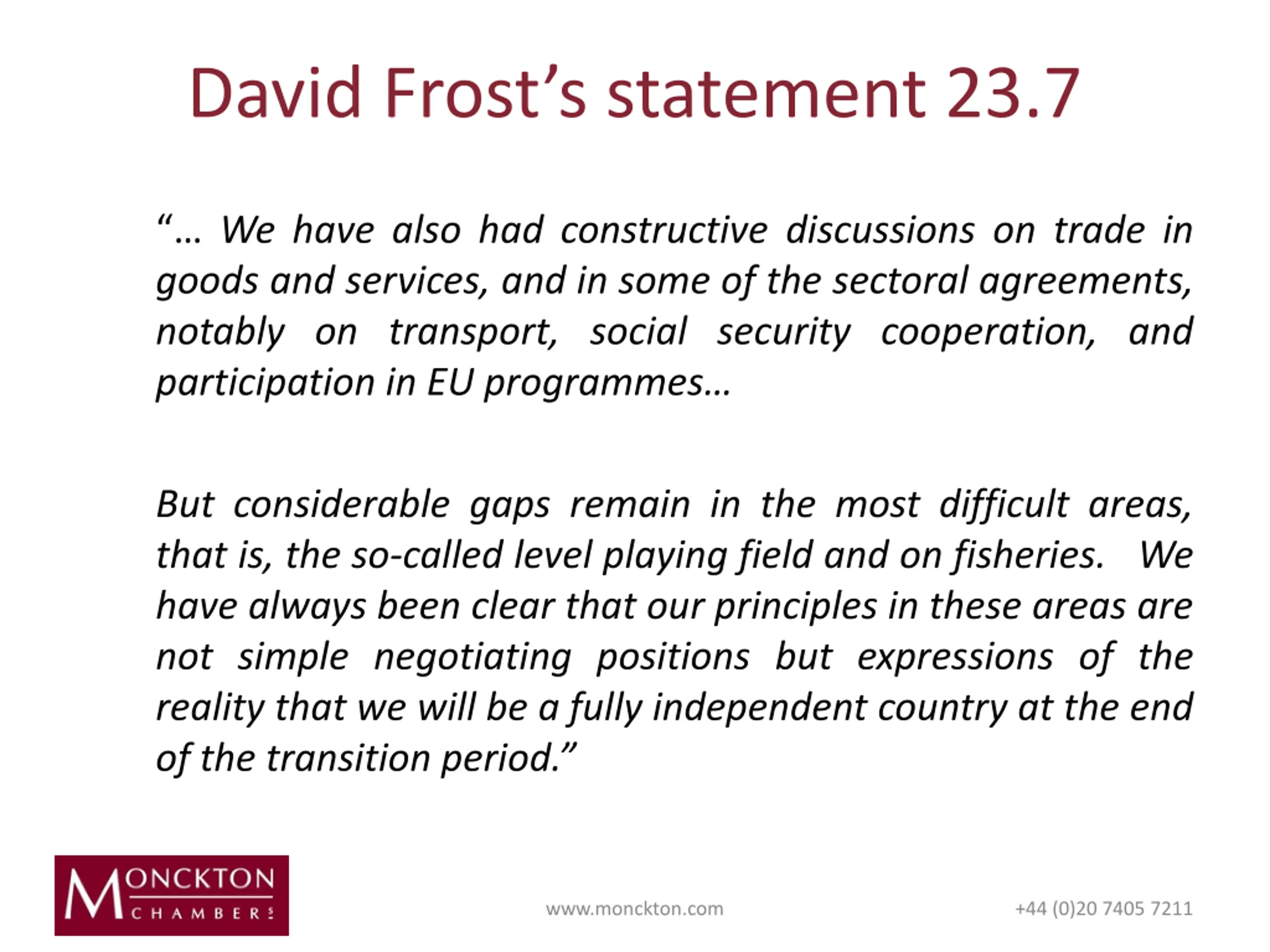 David Frosts statement 23.7 We have also had constructive discussions on trade in goods and services, and in some of the sectoral agreements, notably on transport, social security cooperation, and participation in EU programmes But considerable gaps remain in the most difficult areas, that is, the so-called level playing field and on fisheries. We have always been clear that our principles in these areas are not simple negotiating positions but expressions of the reality that we will be a fully independent country at the end of the transition period. www.monckton.com +44 (0)20 7405 7211