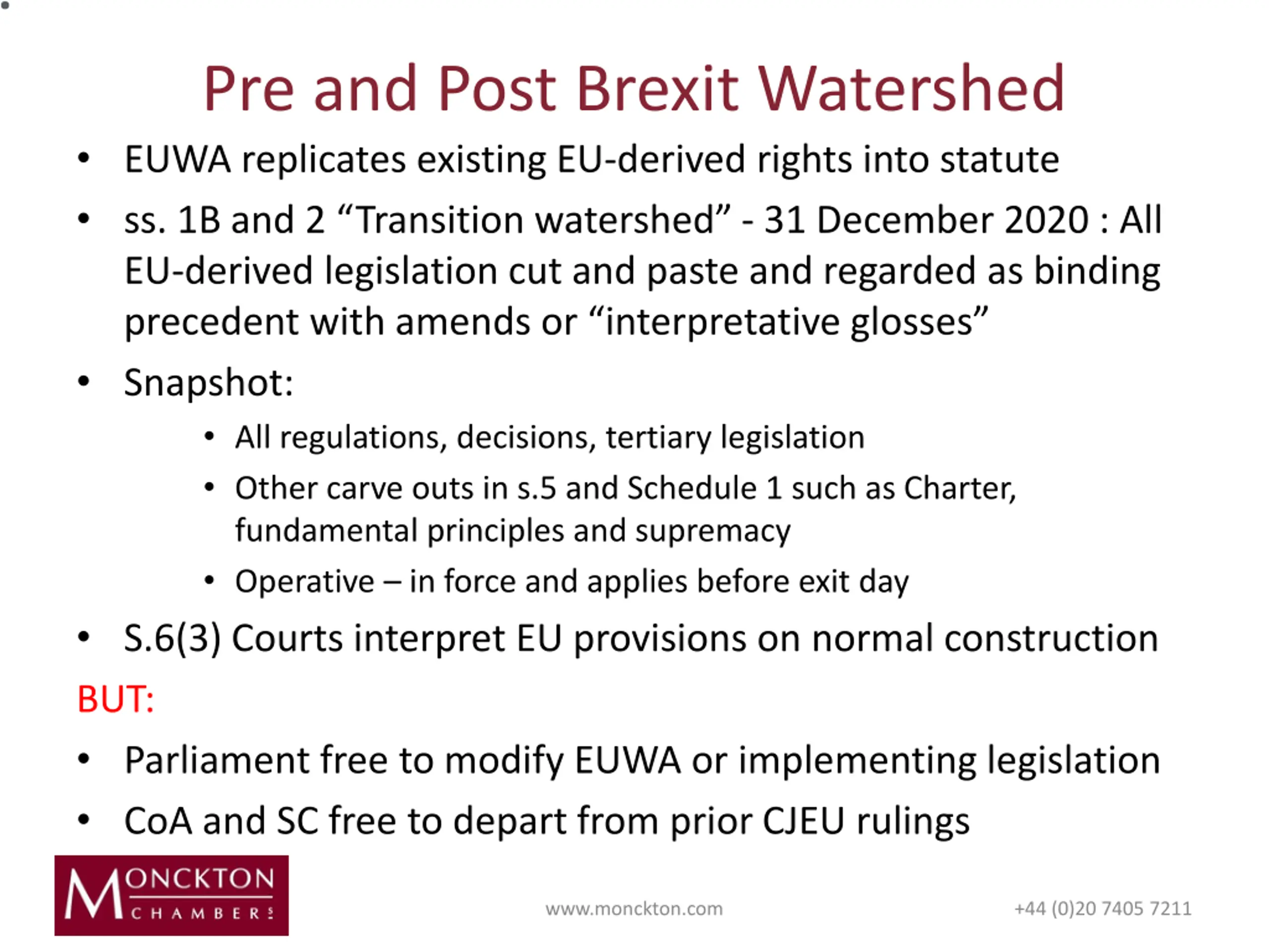 Pre and Post Brexit Watershed EUWA replicates existing EU-derived rights into statute ss. 1B and 2 Transition watershed - 31 December 2020 : All EU-derived legislation cut and paste and regarded as binding precedent with amends or interpretative glosses Snapshot: All regulations, decisions, tertiary legislation Other carve outs in s.5 and Schedule 1 such as Charter, fundamental principles and supremacy Operative in force and applies before exit day S.6(3) Courts interpret EU provisions on normal construction BUT: Parliament free to modify EUWA or implementing legislation CoA and SC free to depart from prior CJEU rulings www.monckton.com +44 (0)20 7405 7211