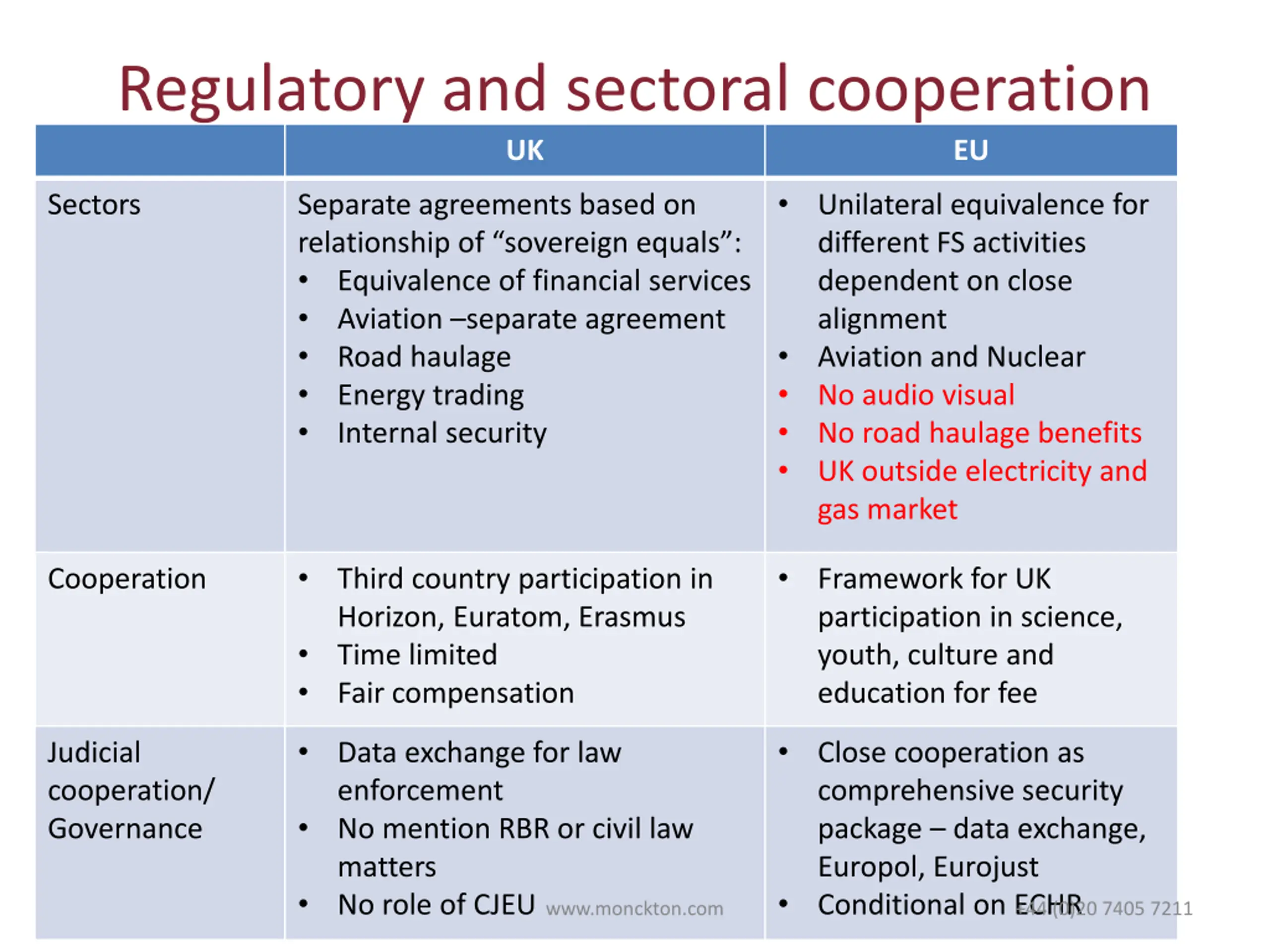 Regulatory and sectoral cooperation UK EU Sectors Separate agreements based on relationship of sovereign equals : Equivalence of financial services Aviation separate agreement Road haulage Energy trading Internal security Unilateral equivalence for different FS activities dependent on close alignment Aviation and Nuclear No audio visual No road haulage benefits UK outside electricity and gas market Cooperation Third country participation in Horizon, Euratom, Erasmus Time limited Fair compensation Framework for UK participation in science, youth, culture and education for fee Judicial cooperation/ Governance Data exchange for law enforcement No mention RBR or civil law matters No role of CJEU Close cooperation as comprehensive security package data exchange, Europol, Eurojust Conditional on ECHR www.monckton.com +44 (0)20 7405 7211