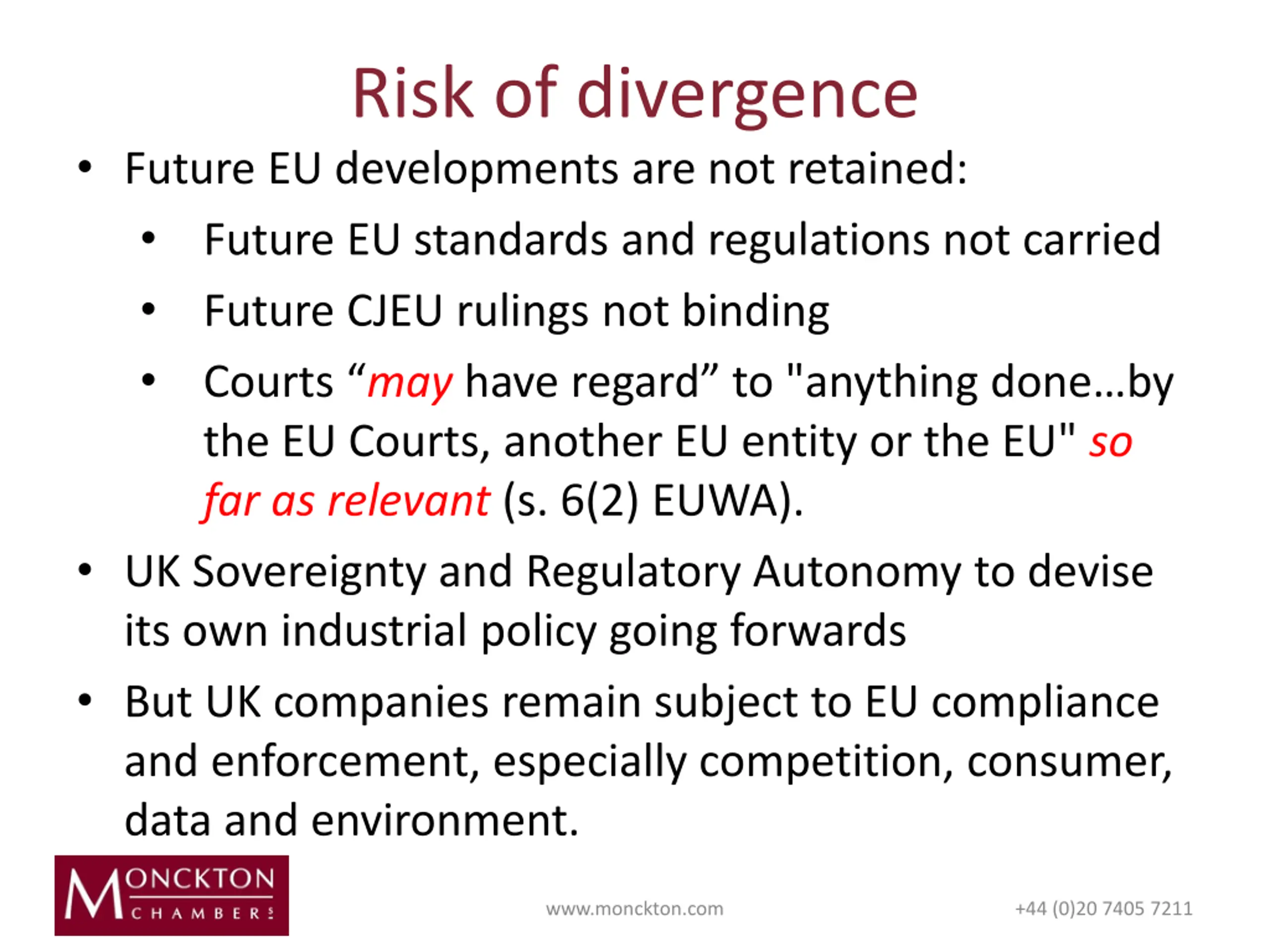 Risk of divergence Future EU developments are not retained: Future EU standards and regulations not carried Future CJEU rulings not binding Courts mayhave regard to "anything done by the EU Courts, another EU entity or the EU" so far as relevant (s. 6(2) EUWA). UK Sovereignty and Regulatory Autonomy to devise its own industrial policy going forwards But UK companies remain subject to EU compliance and enforcement, especially competition, consumer, data and environment. www.monckton.com +44 (0)20 7405 7211