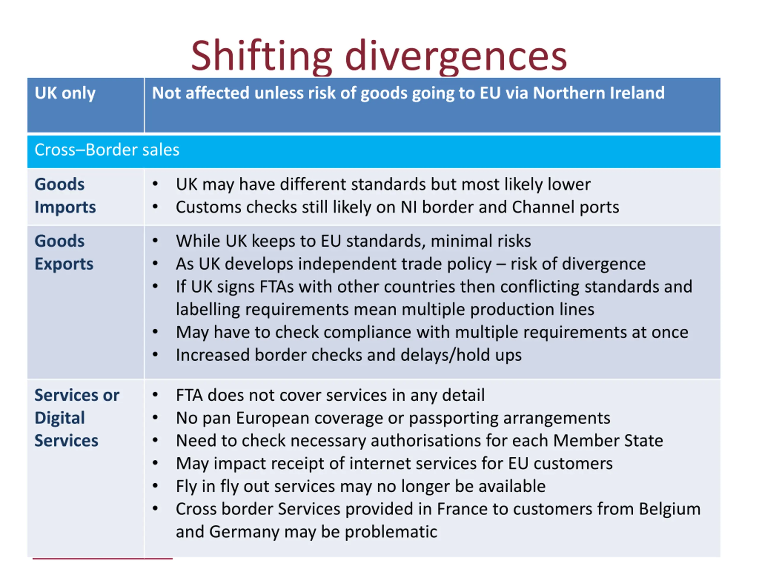 Shifting divergences Not affected unless risk of goods going to EU via Northern Ireland UK only Cross Border sales Goods Imports UK may have different standards but most likely lower Customs checks still likely on NI border and Channel ports Goods Exports While UK keeps to EU standards, minimal risks As UK develops independent trade policy risk of divergence If UK signs FTAs with other countries then conflicting standards and labelling requirements mean multiple production lines May have to check compliance with multiple requirements at once Increased border checks and delays/hold ups Services or Digital Services FTA does not cover services in any detail No pan European coverage or passporting arrangements Need to check necessary authorisations for each Member State May impact receipt of internet services for EU customers Fly in fly out services may no longer be available Cross border Services provided in France to customers from Belgium and Germany may be problematic www.monckton.com +44 (0)20 7405 7211