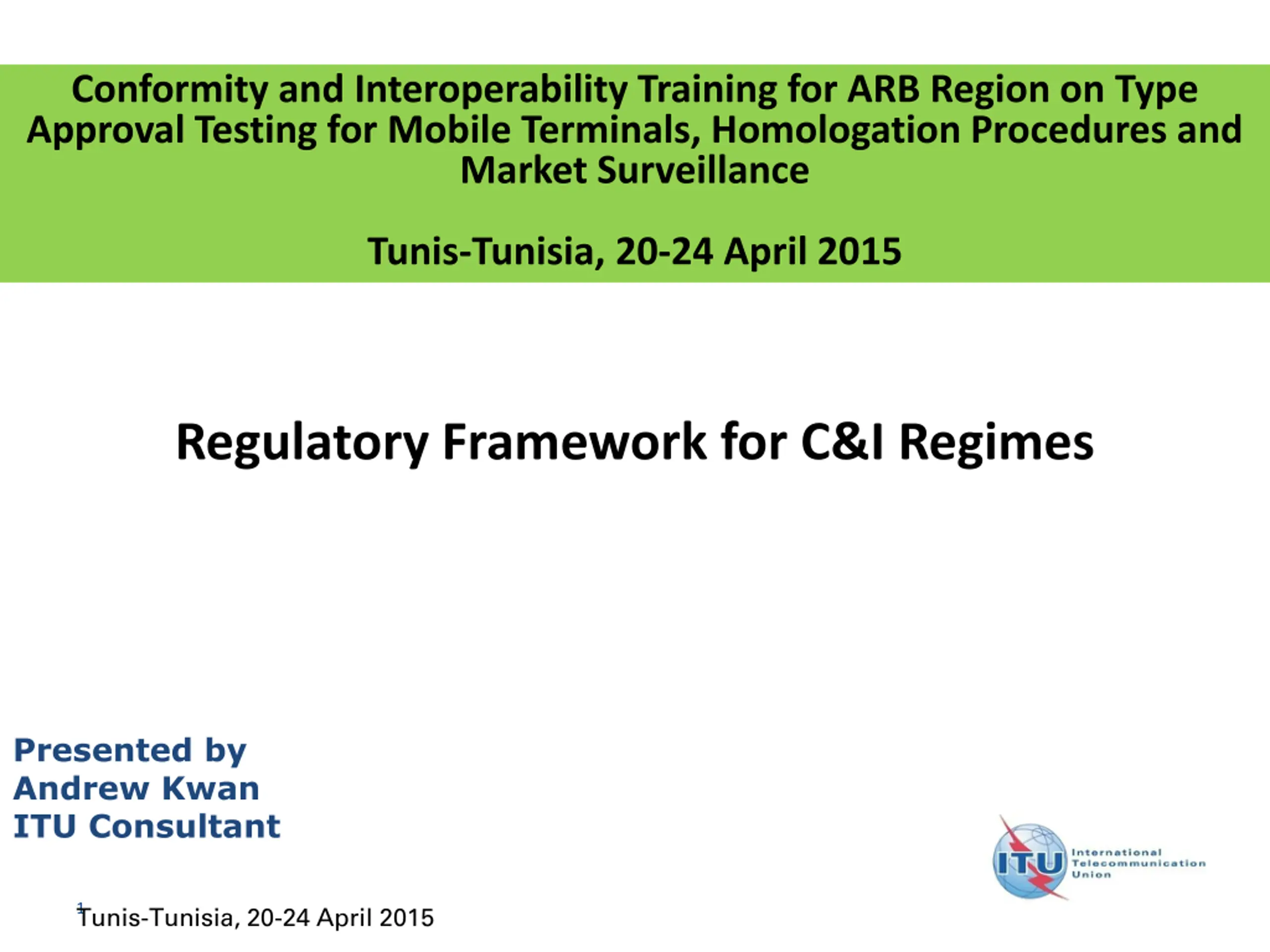 Conformity and Interoperability Training for ARB Region on Type Approval Testing for Mobile Terminals, Homologation Procedures and Market Surveillance Tunis-Tunisia, 20-24 April 2015 Regulatory Framework for C&I Regimes Presented by Andrew Kwan ITU Consultant 1 Tunis-Tunisia, 20-24 April 2015