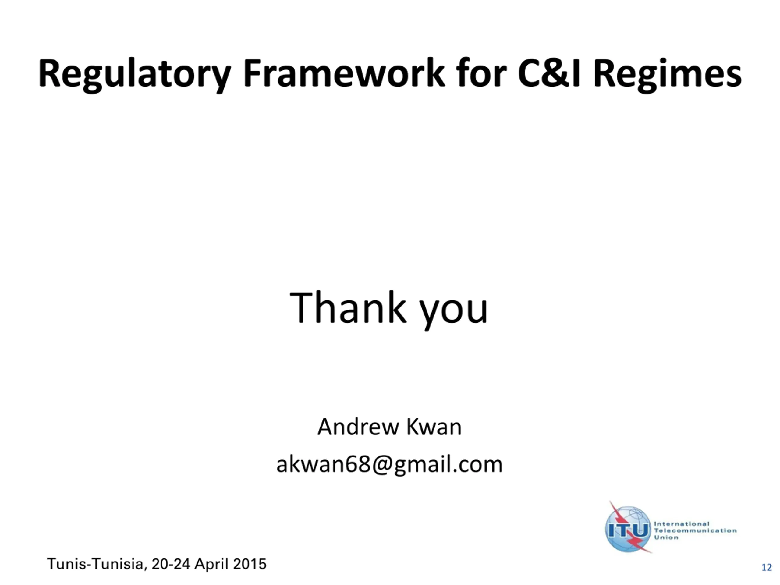 Regulatory Framework for C&I Regimes Thank you Andrew Kwan akwan68@gmail.com Tunis-Tunisia, 20-24 April 2015 12