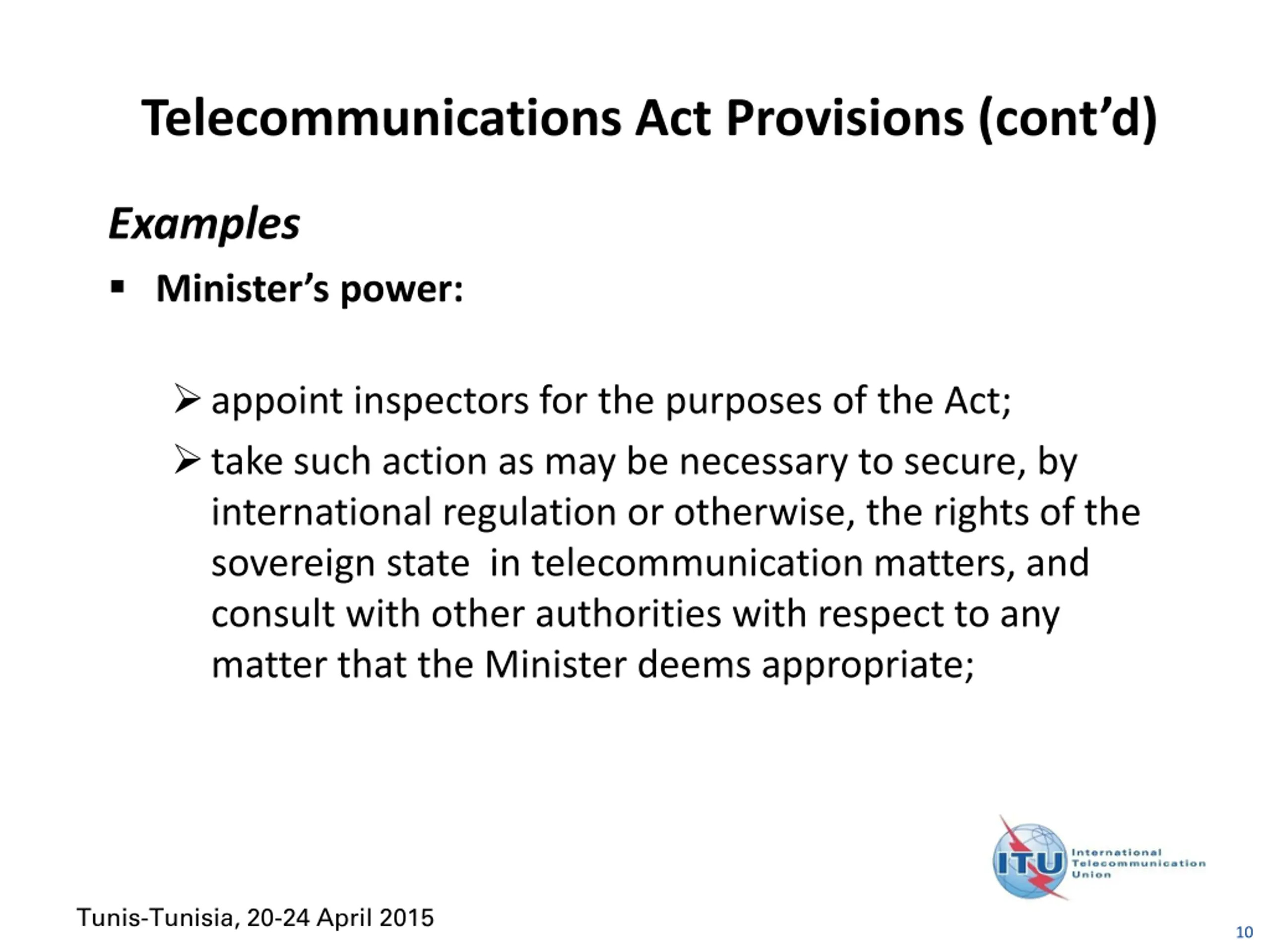 Telecommunications Act Provisions (contd) Examples Minister s power: amend the terms and conditions of certificate or authorization establish technical requirements, technical standards and conformity assessment requirements in relation to radio equipment, interference-causing equipment, and telecom equipment test radio and telecom equipment for compliance with technical standards established under this Act; Tunis-Tunisia, 20-24 April 2015 9