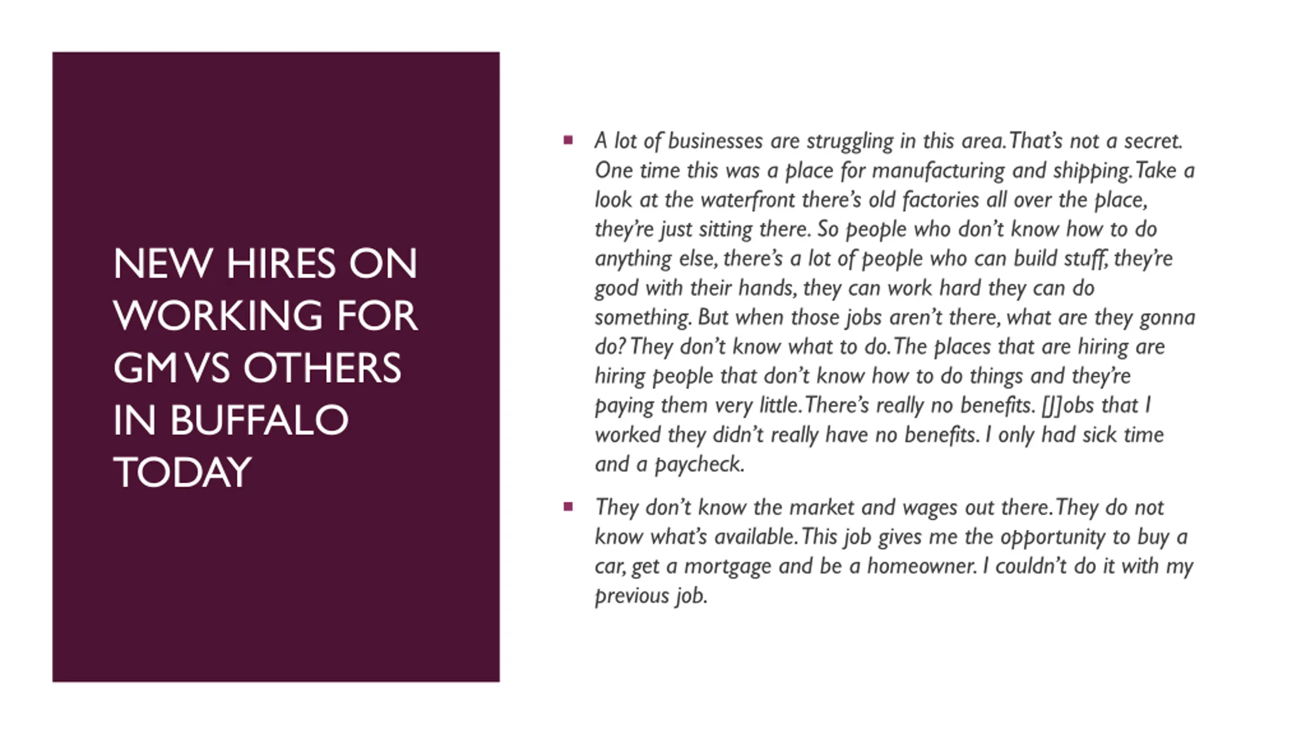 A lot of businesses are struggling in this area. Thats not a secret. One time this was a place for manufacturing and shipping. Take a look at the waterfront there s old factories all over the place, they re just sitting there. So people who don t know how to do anything else, there s a lot of people who can build stuff, they re good with their hands, they can work hard they can do something. But when those jobs aren t there, what are they gonna do? They don t know what to do. The places that are hiring are hiring people that don t know how to do things and they re paying them very little. There s really no benefits. [J]obs that I worked they didn t really have no benefits. I only had sick time and a paycheck. NEW HIRES ON WORKING FOR GM VS OTHERS IN BUFFALO TODAY They don t know the market and wages out there. They do not know what s available. This job gives me the opportunity to buy a car, get a mortgage and be a homeowner. I couldn t do it with my previous job.