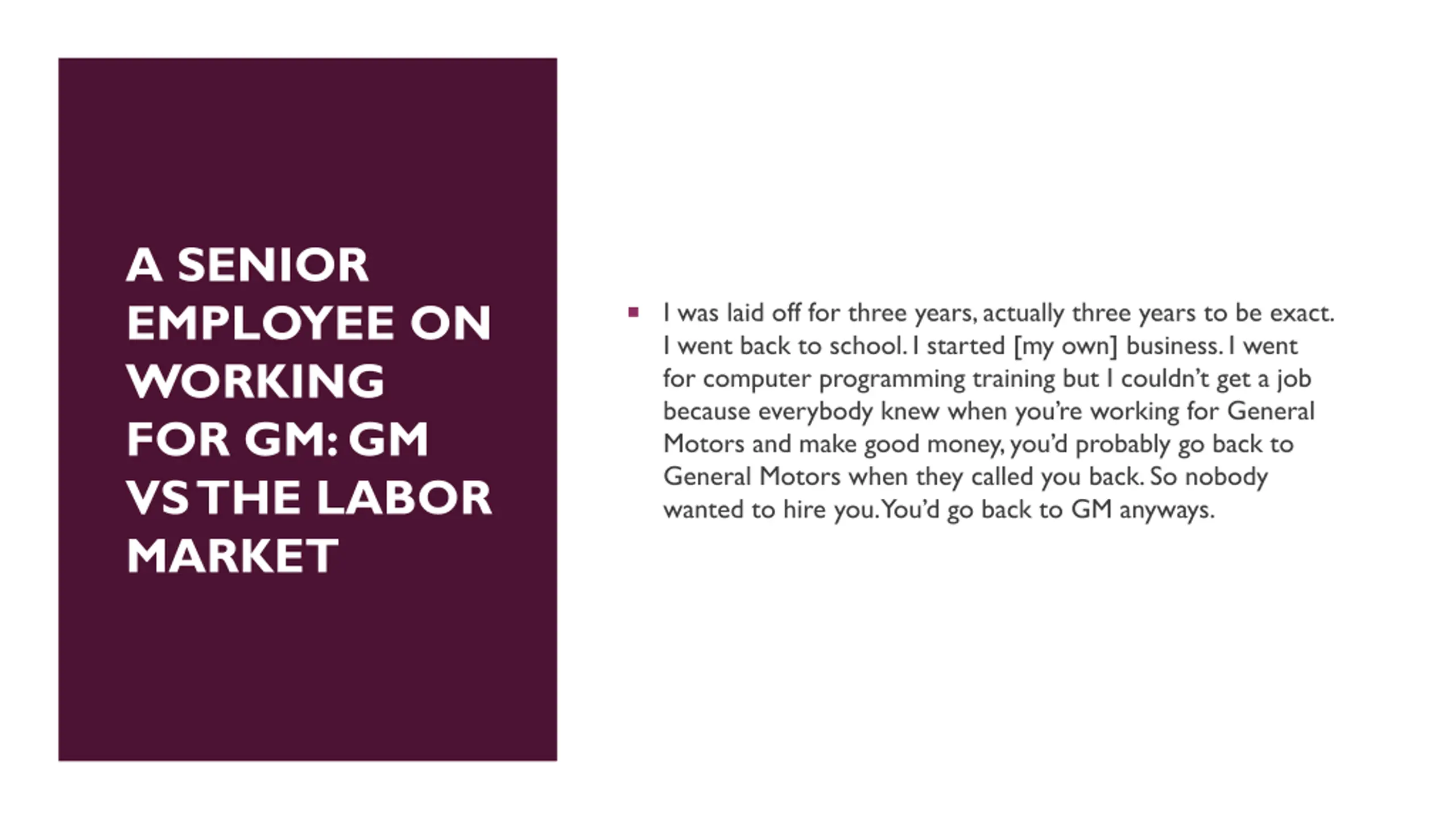 A SENIOR EMPLOYEE ON WORKING FOR GM: GM VS THE LABOR MARKET I was laid off for three years, actually three years to be exact. I went back to school. I started [my own] business. I went for computer programming training but I couldn t get a job because everybody knew when you re working for General Motors and make good money, you d probably go back to General Motors when they called you back. So nobody wanted to hire you. You d go back to GM anyways.