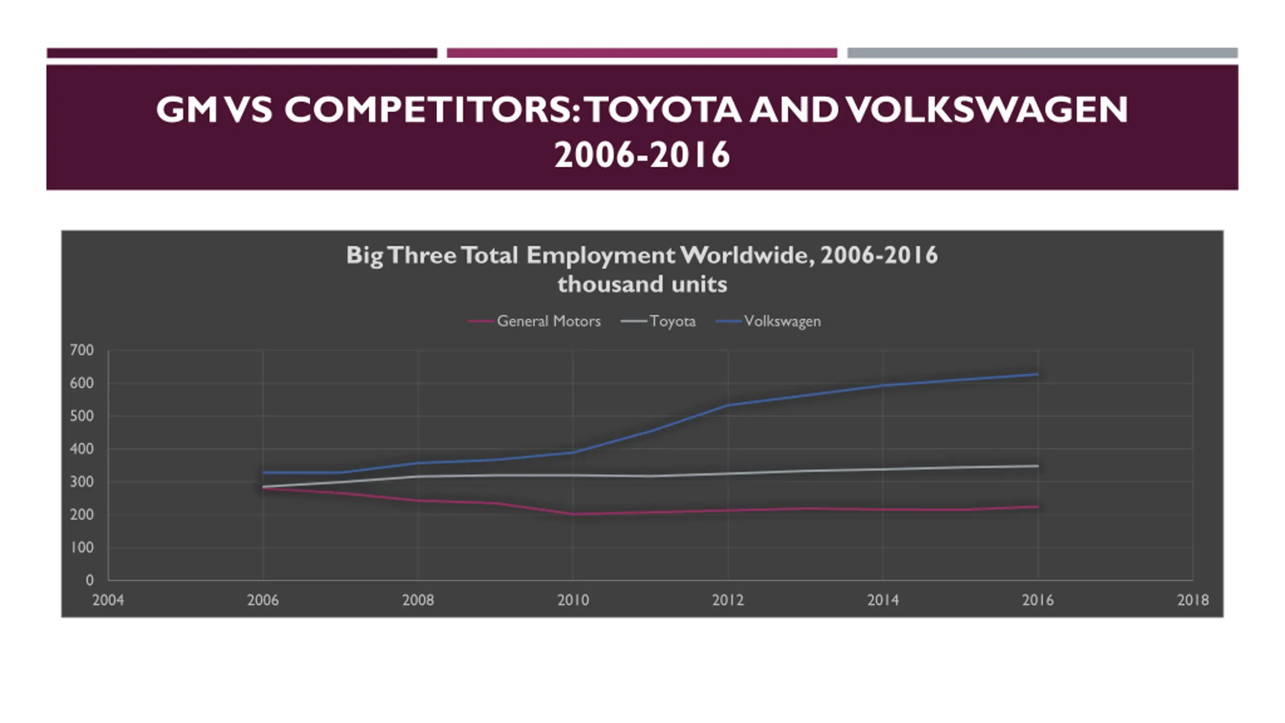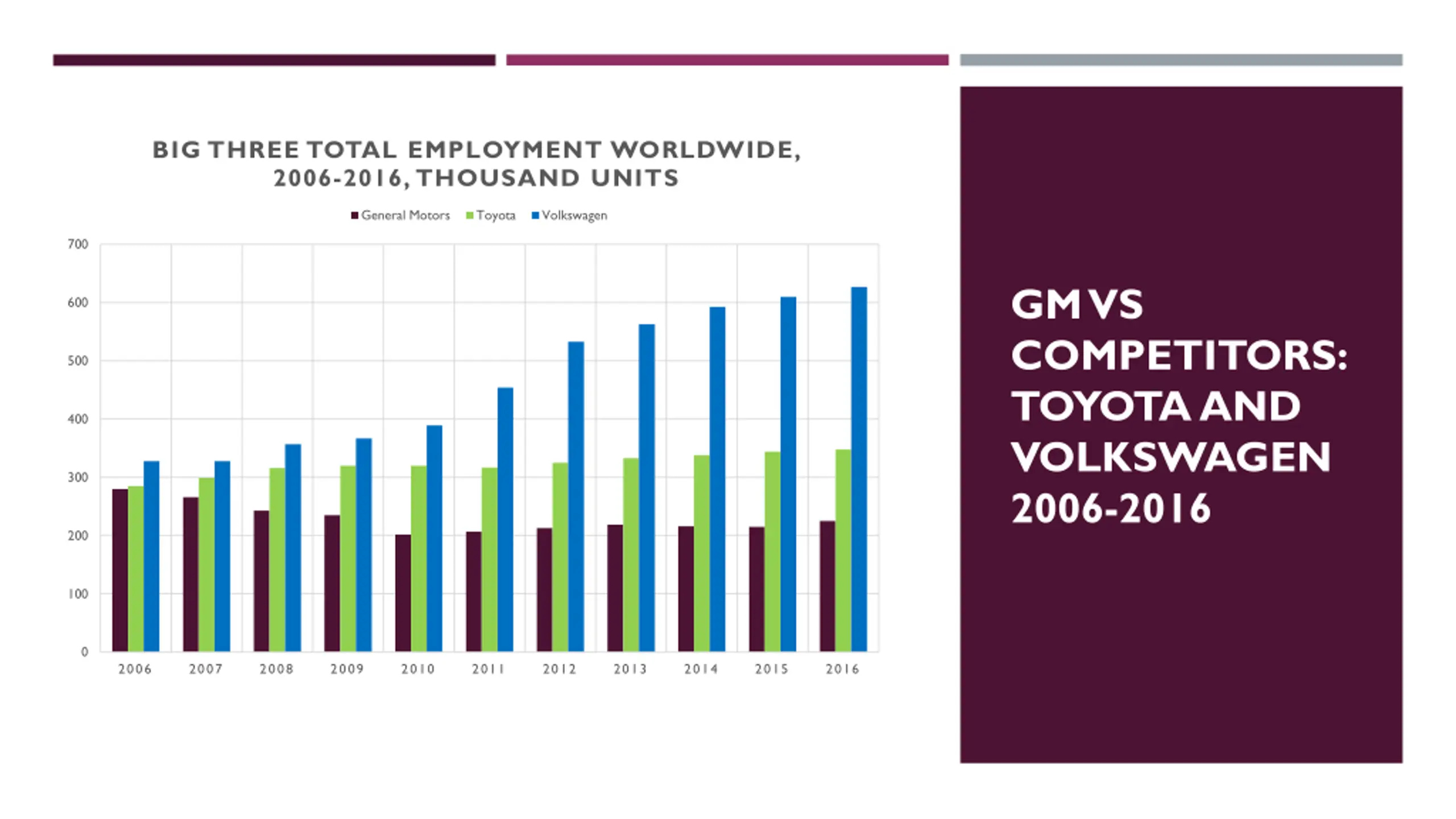 GM VS COMPETITORS: TOYOTA AND VOLKSWAGEN 2006-2016 Big Three Total Employment Worldwide, 2006-2016 thousand units General Motors Toyota Volkswagen 700 600 500 400 300 200 100 0 2004 2006 2008 2010 2012 2014 2016 2018
