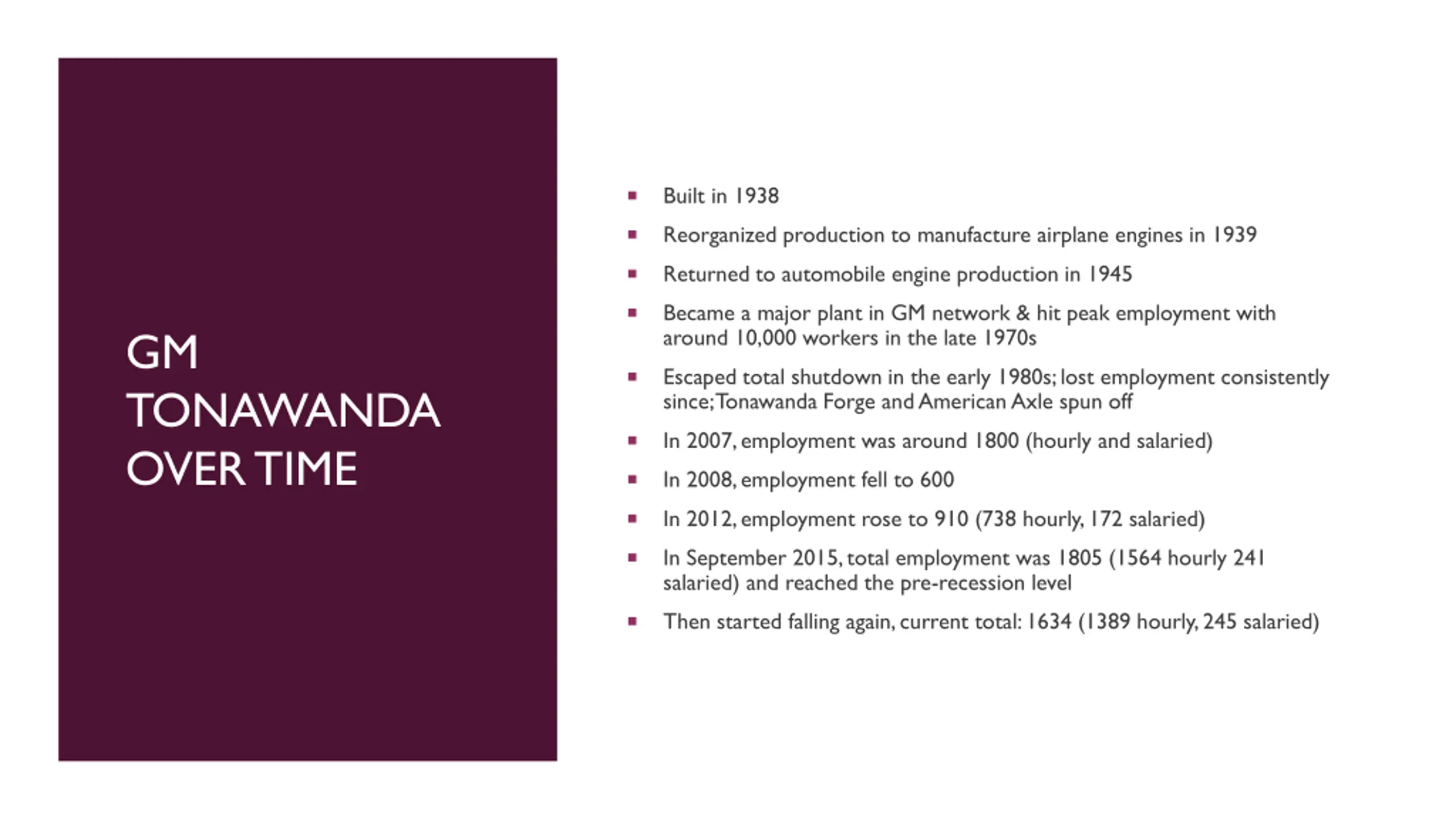 Built in 1938 Reorganized production to manufacture airplane engines in 1939 Returned to automobile engine production in 1945 Became a major plant in GM network & hit peak employment with around 10,000 workers in the late 1970s GM TONAWANDA OVER TIME Escaped total shutdown in the early 1980s; lost employment consistently since; Tonawanda Forge and American Axle spun off In 2007, employment was around 1800 (hourly and salaried) In 2008, employment fell to 600 In 2012, employment rose to 910 (738 hourly, 172 salaried) In September 2015, total employment was 1805 (1564 hourly 241 salaried) and reached the pre-recession level Then started falling again, current total: 1634 (1389 hourly, 245 salaried)