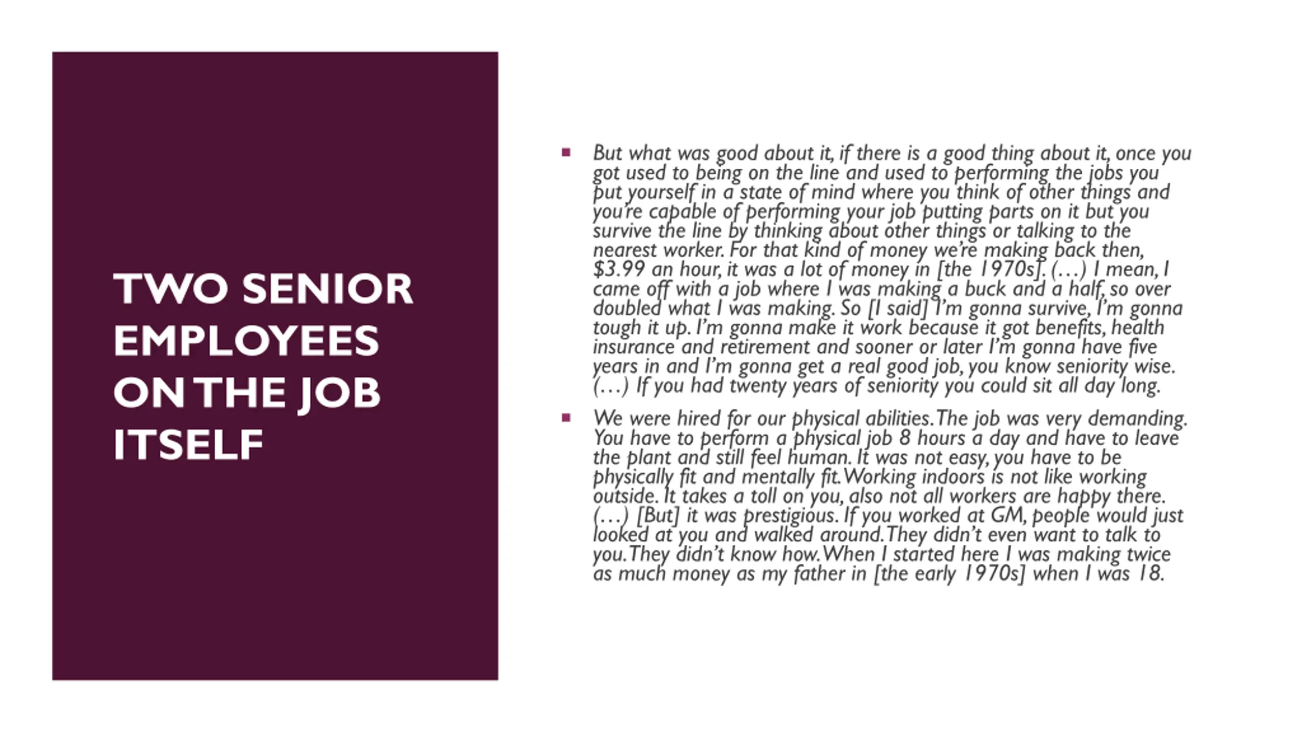 But what was good about it, if there is a good thing about it, once you got used to being on the line and used to performing the jobs you put yourself in a state of mind where you think of other things and you re capable of performing your job putting parts on it but you survive the line by thinking about other things or talking to the nearest worker. For that kind of money we re making back then, $3.99 an hour, it was a lot of money in [the 1970s]. ( ) I mean, I came off with a job where I was making a buck and a half, so over doubled what I was making. So [I said] I m gonna survive, I m gonna tough it up. I m gonna make it work because it got benefits, health insurance and retirement and sooner or later I m gonna have five years in and I m gonna get a real good job, you know seniority wise. ( ) If you had twenty years of seniority you could sit all day long. We were hired for our physical abilities. The job was very demanding. You have to perform a physical job 8 hours a day and have to leave the plant and still feel human. It was not easy, you have to be physically fit and mentally fit. Working indoors is not like working outside. It takes a toll on you, also not all workers are happy there. ( ) [But] it was prestigious. If you worked at GM, people would just looked at you and walked around. They didn t even want to talk to you. They didn t know how. When I started here I was making twice as much money as my father in [the early 1970s] when I was 18. TWO SENIOR EMPLOYEES ON THE JOB ITSELF