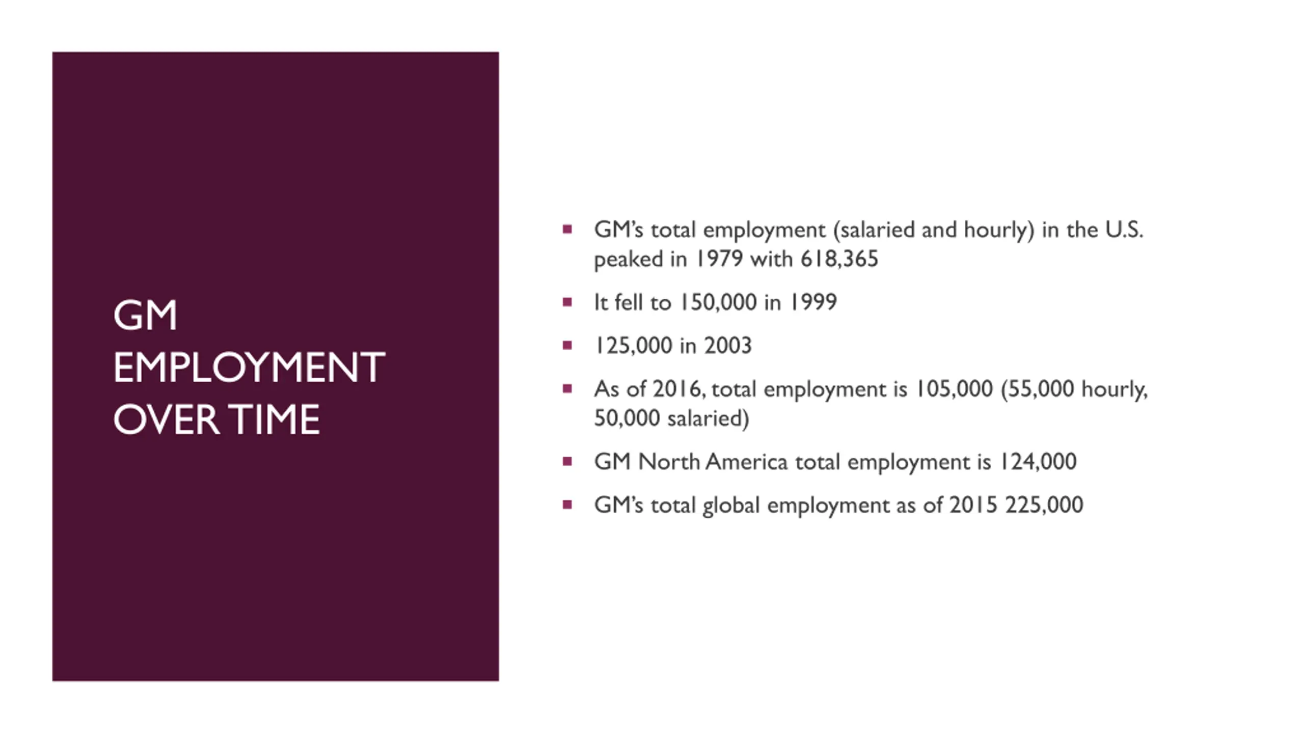 GMs total employment (salaried and hourly) in the U.S. peaked in 1979 with 618,365 It fell to 150,000 in 1999 GM EMPLOYMENT OVER TIME 125,000 in 2003 As of 2016, total employment is 105,000 (55,000 hourly, 50,000 salaried) GM North America total employment is 124,000 GM s total global employment as of 2015 225,000