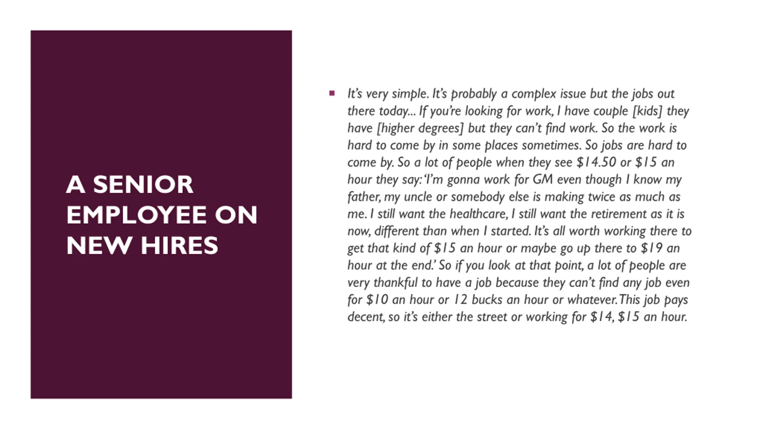 Its very simple. Its probably a complex issue but the jobs out there today... If you re looking for work, I have couple [kids] they have [higher degrees] but they can t find work. So the work is hard to come by in some places sometimes. So jobs are hard to come by. So a lot of people when they see $14.50 or $15 an hour they say: I m gonna work for GM even though I know my father, my uncle or somebody else is making twice as much as me. I still want the healthcare, I still want the retirement as it is now, different than when I started. It s all worth working there to get that kind of $15 an hour or maybe go up there to $19 an hour at the end. So if you look at that point, a lot of people are very thankful to have a job because they can t find any job even for $10 an hour or 12 bucks an hour or whatever. This job pays decent, so it s either the street or working for $14, $15 an hour. A SENIOR EMPLOYEE ON NEW HIRES