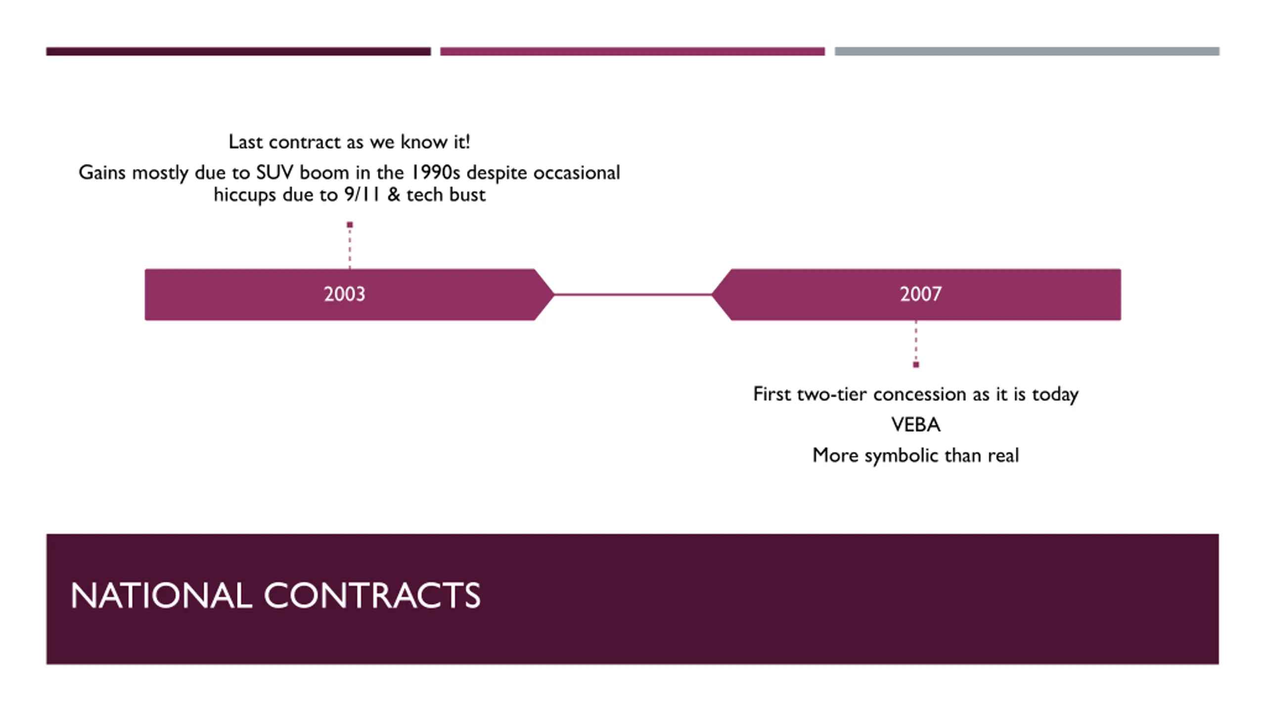 Last contract as we know it! Gains mostly due to SUV boom in the 1990s despite occasional hiccups due to 9/11 & tech bust 2003 2007 First two-tier concession as it is today VEBA More symbolic than real NATIONAL CONTRACTS