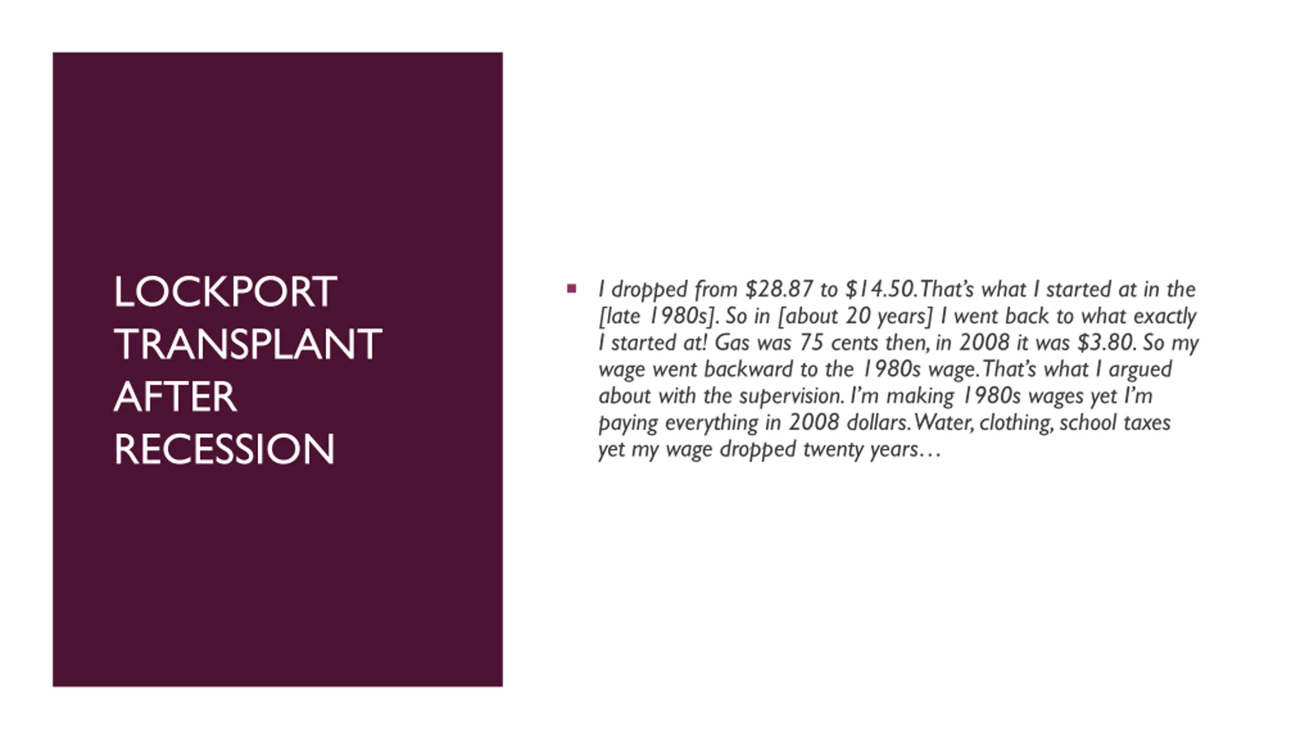 LOCKPORT TRANSPLANT AFTER RECESSION I dropped from $28.87 to $14.50. That s what I started at in the [late 1980s]. So in [about 20 years] I went back to what exactly I started at! Gas was 75 cents then, in 2008 it was $3.80. So my wage went backward to the 1980s wage. That s what I argued about with the supervision. I m making 1980s wages yet I m paying everything in 2008 dollars. Water, clothing, school taxes yet my wage dropped twenty years
