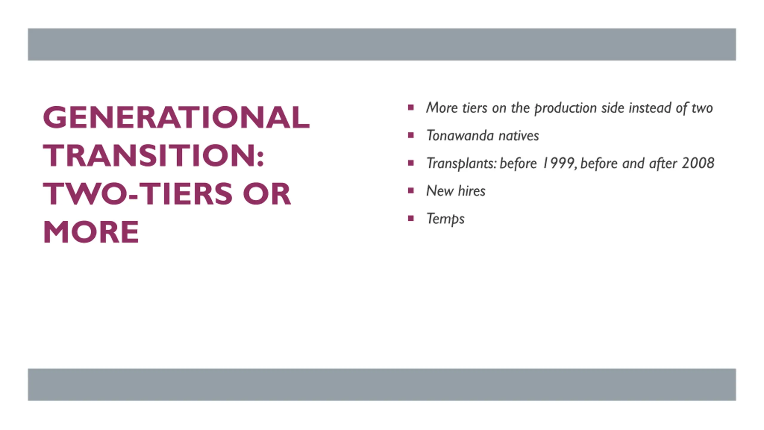 More tiers on the production side instead of two GENERATIONAL TRANSITION: TWO-TIERS OR MORE Tonawanda natives Transplants: before 1999, before and after 2008 New hires Temps