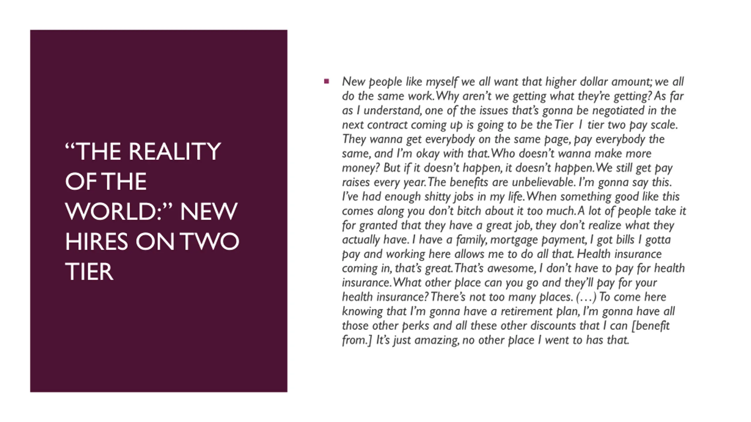 New people like myself we all want that higher dollar amount; we all do the same work. Why aren t we getting what they re getting? As far as I understand, one of the issues that s gonna be negotiated in the next contract coming up is going to be the Tier 1 tier two pay scale. They wanna get everybody on the same page, pay everybody the same, and I m okay with that. Who doesn t wanna make more money? But if it doesn t happen, it doesn t happen. We still get pay raises every year. The benefits are unbelievable. I m gonna say this. I ve had enough shitty jobs in my life. When something good like this comes along you don t bitch about it too much. A lot of people take it for granted that they have a great job, they don t realize what they actually have. I have a family, mortgage payment, I got bills I gotta pay and working here allows me to do all that. Health insurance coming in, that s great. That s awesome, I don t have to pay for health insurance. What other place can you go and they ll pay for your health insurance? There s not too many places. ( ) To come here knowing that I m gonna have a retirement plan, I m gonna have all those other perks and all these other discounts that I can [benefit from.] It s just amazing, no other place I went to has that. THE REALITY OF THE WORLD: NEW HIRES ON TWO TIER