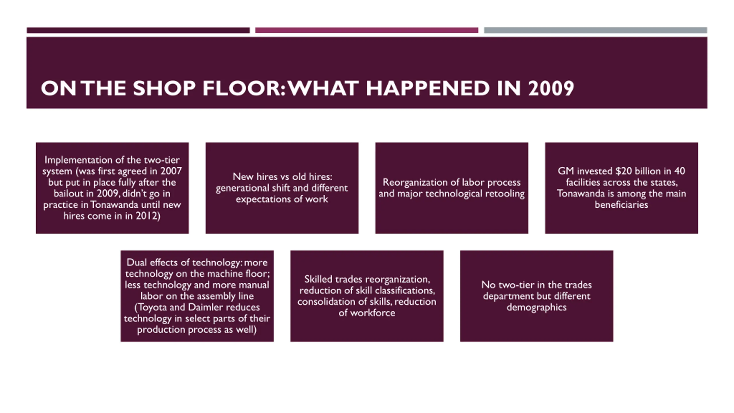 ON THE SHOP FLOOR: WHAT HAPPENED IN 2009 Implementation of the two-tier system (was first agreed in 2007 but put in place fully after the bailout in 2009, didn t go in practice in Tonawanda until new hires come in in 2012) GM invested $20 billion in 40 facilities across the states, Tonawanda is among the main beneficiaries New hires vs old hires: generational shift and different expectations of work Reorganization of labor process and major technological retooling Dual effects of technology: more technology on the machine floor; less technology and more manual labor on the assembly line (Toyota and Daimler reduces technology in select parts of their production process as well) Skilled trades reorganization, reduction of skill classifications, consolidation of skills, reduction of workforce No two-tier in the trades department but different demographics