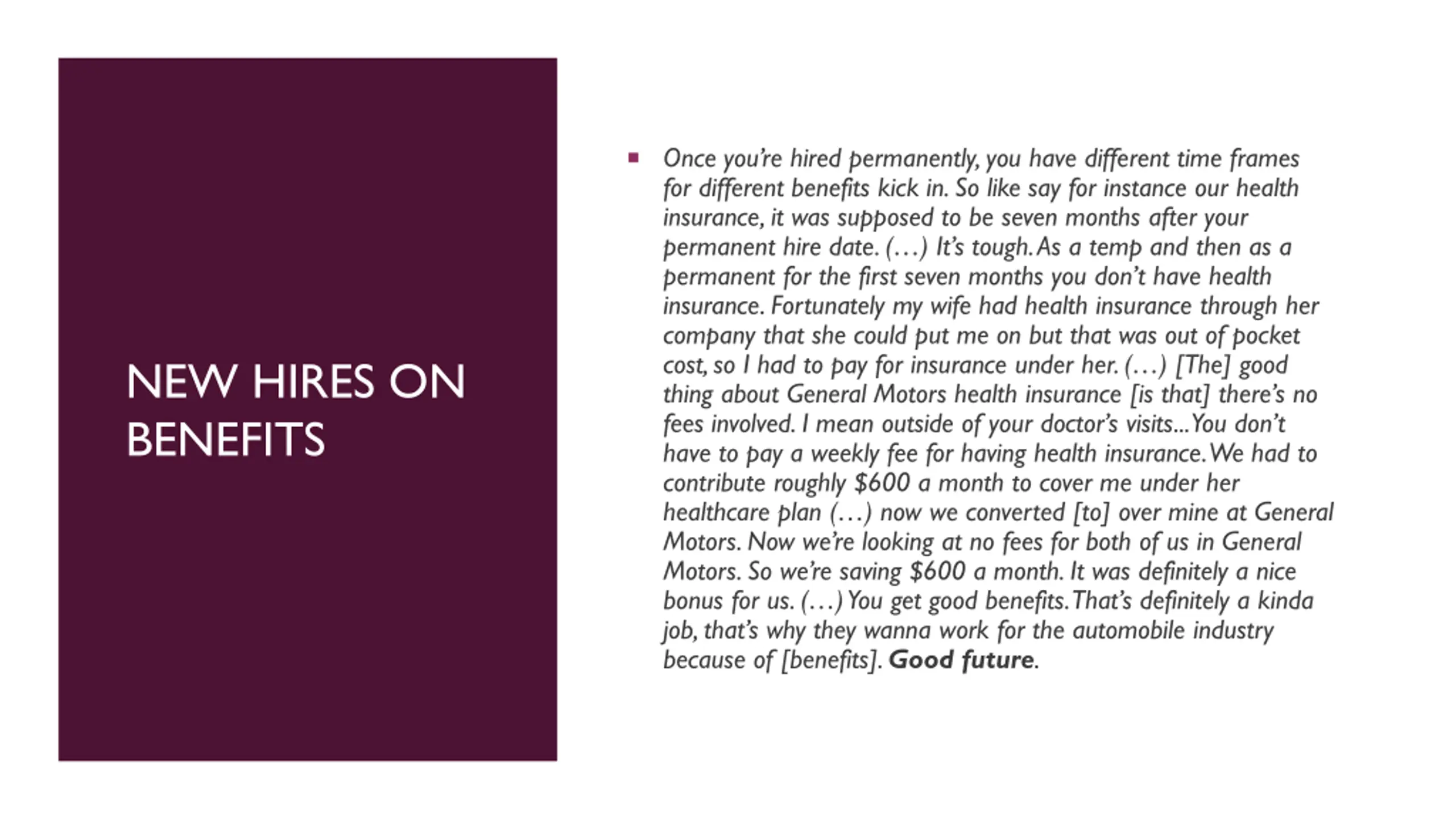Once youre hired permanently, you have different time frames for different benefits kick in. So like say for instance our health insurance, it was supposed to be seven months after your permanent hire date. ( ) It s tough. As a temp and then as a permanent for the first seven months you don t have health insurance. Fortunately my wife had health insurance through her company that she could put me on but that was out of pocket cost, so I had to pay for insurance under her. ( ) [The] good thing about General Motors health insurance [is that] there s no fees involved. I mean outside of your doctor s visits... You don t have to pay a weekly fee for having health insurance. We had to contribute roughly $600 a month to cover me under her healthcare plan ( ) now we converted [to] over mine at General Motors. Now we re looking at no fees for both of us in General Motors. So we re saving $600 a month. It was definitely a nice bonus for us. ( ) You get good benefits. That s definitely a kinda job, that s why they wanna work for the automobile industry because of [benefits]. Good future. NEW HIRES ON BENEFITS