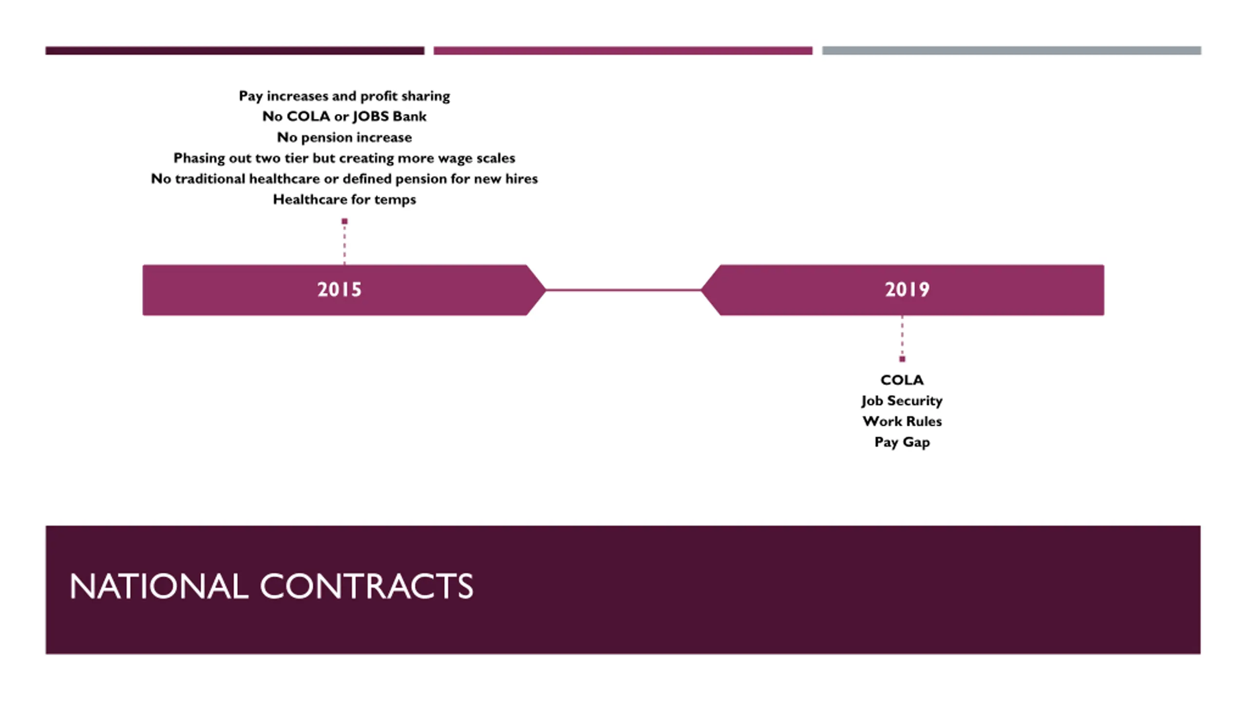 Pay increases and profit sharing No COLA or JOBS Bank No pension increase Phasing out two tier but creating more wage scales No traditional healthcare or defined pension for new hires Healthcare for temps 2015 2019 COLA Job Security Work Rules Pay Gap NATIONAL CONTRACTS