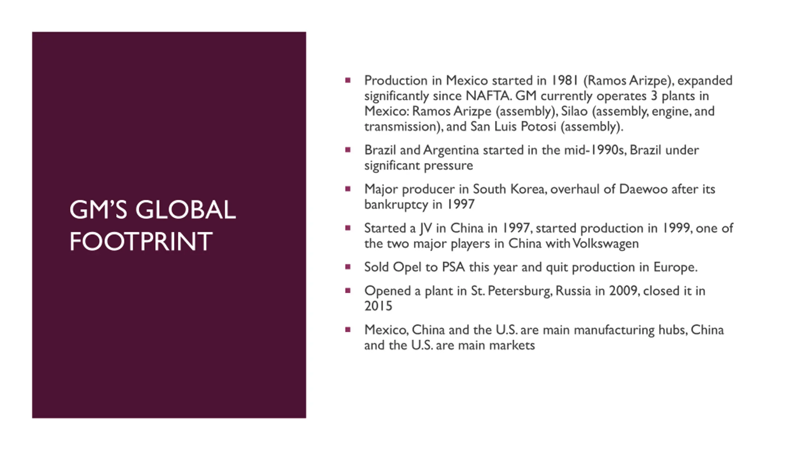 Production in Mexico started in 1981 (Ramos Arizpe), expanded significantly since NAFTA. GM currently operates 3 plants in Mexico: Ramos Arizpe (assembly), Silao (assembly, engine, and transmission), and San Luis Potosi (assembly). Brazil and Argentina started in the mid-1990s, Brazil under significant pressure Major producer in South Korea, overhaul of Daewoo after its bankruptcy in 1997 GM S GLOBAL FOOTPRINT Started a JV in China in 1997, started production in 1999, one of the two major players in China with Volkswagen Sold Opel to PSA this year and quit production in Europe. Opened a plant in St. Petersburg, Russia in 2009, closed it in 2015 Mexico, China and the U.S. are main manufacturing hubs, China and the U.S. are main markets