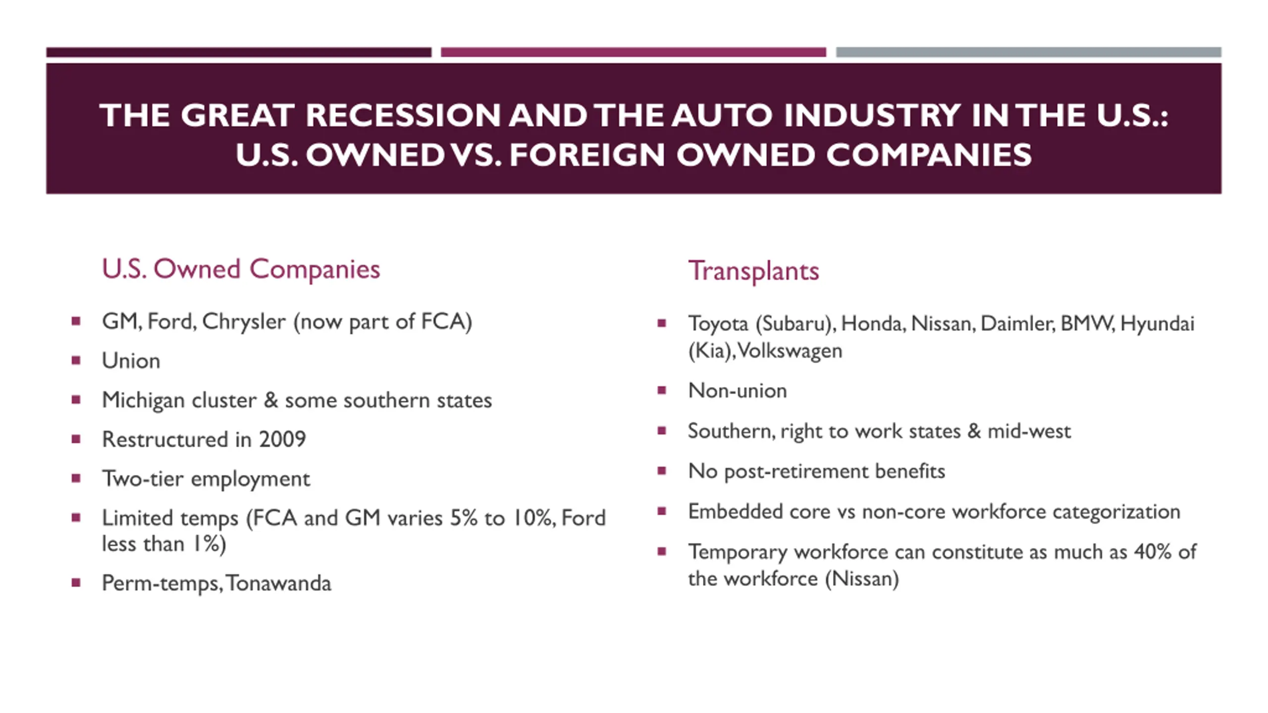 THE GREAT RECESSION AND THE AUTO INDUSTRY IN THE U.S.: U.S. OWNED VS. FOREIGN OWNED COMPANIES U.S. Owned Companies Transplants GM, Ford, Chrysler (now part of FCA) Toyota (Subaru), Honda, Nissan, Daimler, BMW, Hyundai (Kia), Volkswagen Union Non-union Michigan cluster & some southern states Southern, right to work states & mid-west Restructured in 2009 No post-retirement benefits Two-tier employment Embedded core vs non-core workforce categorization Limited temps (FCA and GM varies 5% to 10%, Ford less than 1%) Temporary workforce can constitute as much as 40% of the workforce (Nissan) Perm-temps, Tonawanda