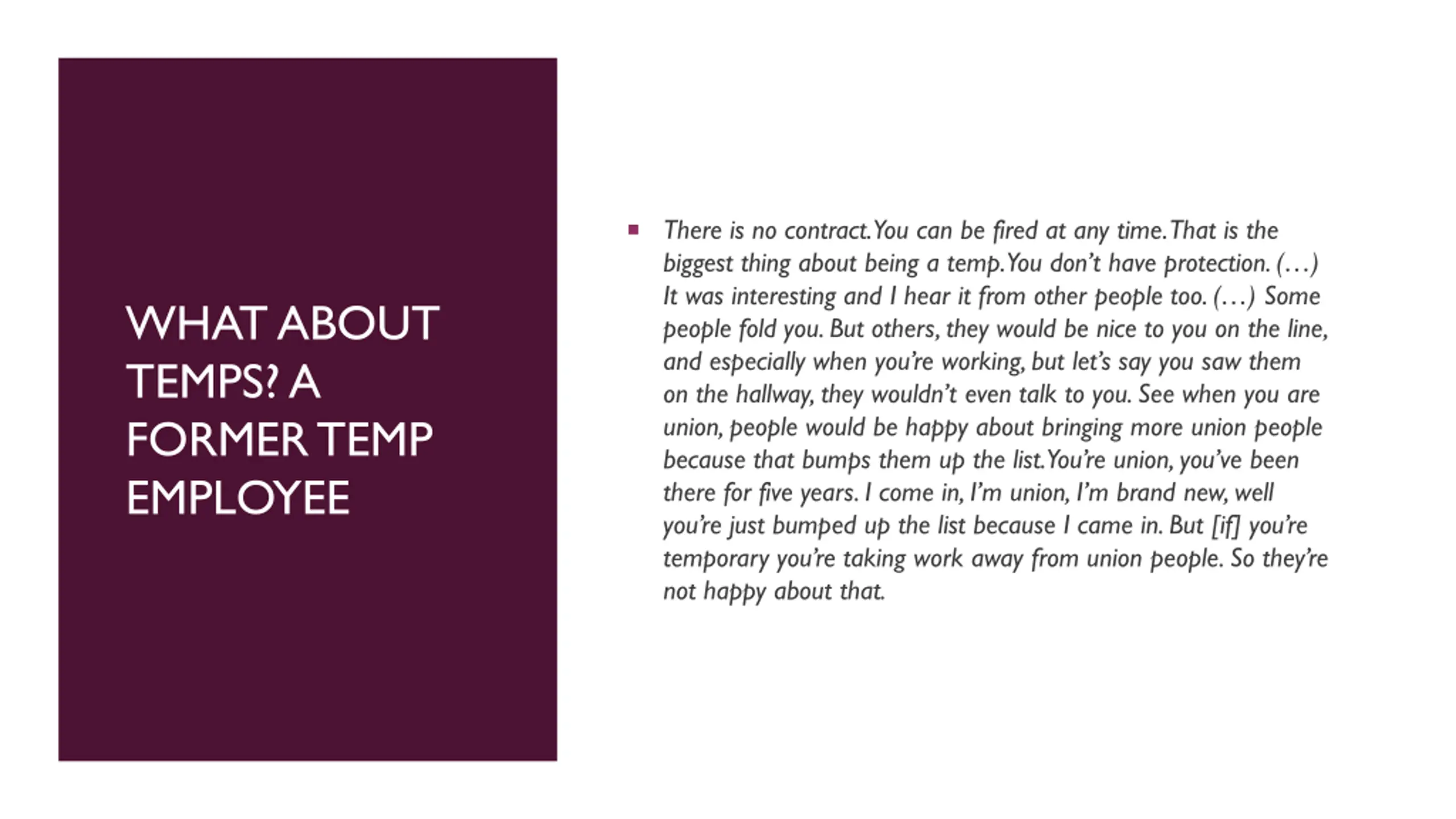 There is no contract. You can be fired at any time. That is the biggest thing about being a temp. You don t have protection. ( ) It was interesting and I hear it from other people too. ( ) Some people fold you. But others, they would be nice to you on the line, and especially when you re working, but let s say you saw them on the hallway, they wouldn t even talk to you. See when you are union, people would be happy about bringing more union people because that bumps them up the list. You re union, you ve been there for five years. I come in, I m union, I m brand new, well you re just bumped up the list because I came in. But [if] you re temporary you re taking work away from union people. So they re not happy about that. WHAT ABOUT TEMPS? A FORMER TEMP EMPLOYEE