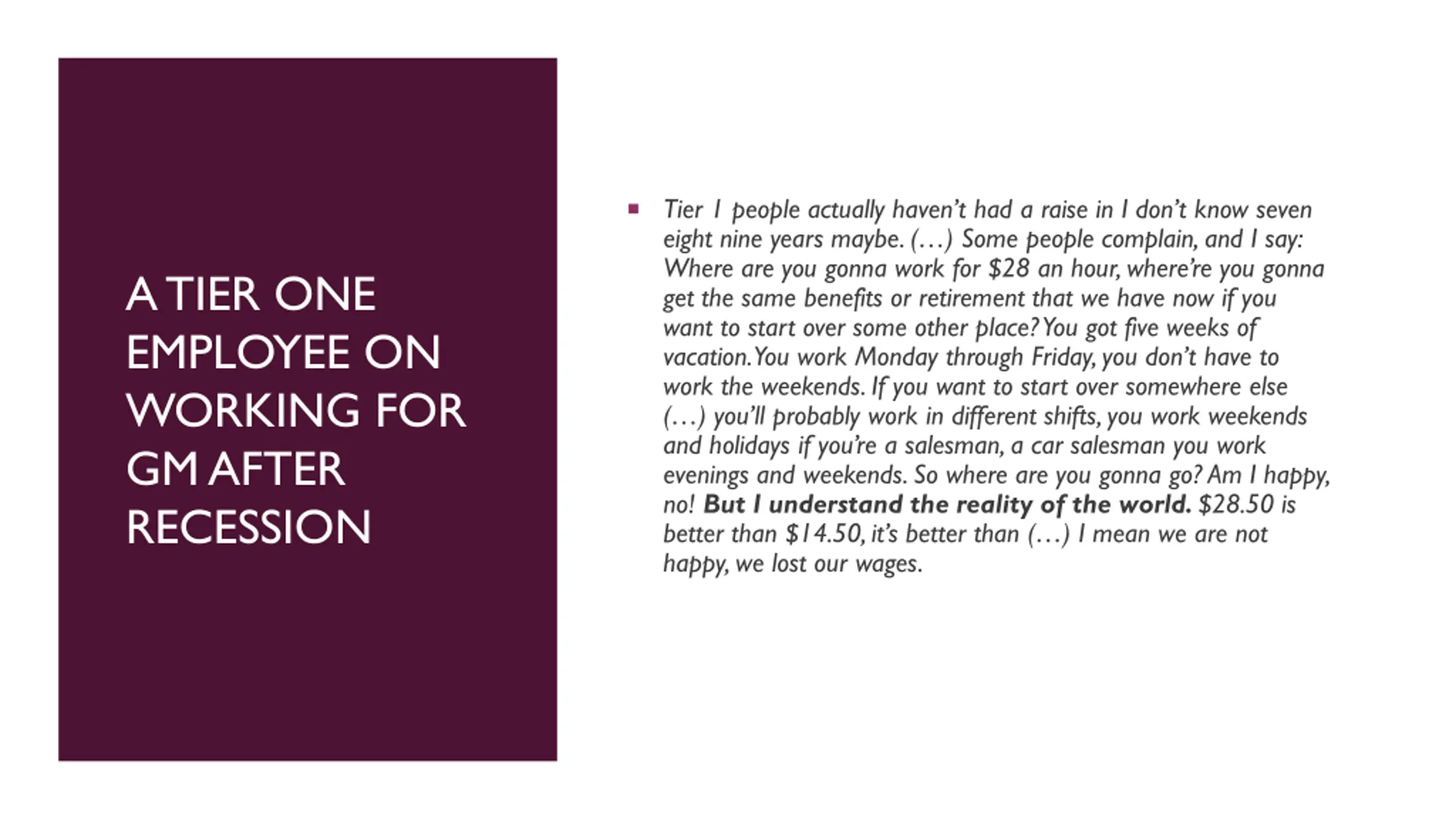 Tier 1 people actually havent had a raise in I dont know seven eight nine years maybe. ( ) Some people complain, and I say: Where are you gonna work for $28 an hour, where re you gonna get the same benefits or retirement that we have now if you want to start over some other place? You got five weeks of vacation. You work Monday through Friday, you don t have to work the weekends. If you want to start over somewhere else ( ) you ll probably work in different shifts, you work weekends and holidays if you re a salesman, a car salesman you work evenings and weekends. So where are you gonna go? Am I happy, no! But I understand the reality of the world. $28.50 is better than $14.50, it s better than ( ) I mean we are not happy, we lost our wages. A TIER ONE EMPLOYEE ON WORKING FOR GM AFTER RECESSION