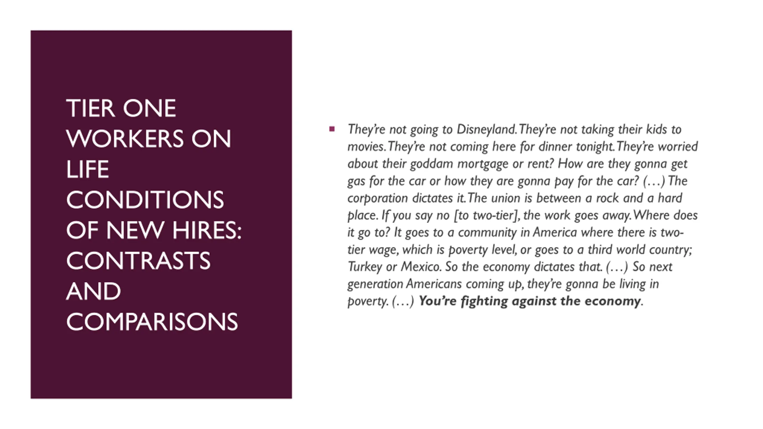 TIER ONE WORKERS ON LIFE CONDITIONS OF NEW HIRES: CONTRASTS AND COMPARISONS They re not going to Disneyland. They re not taking their kids to movies. They re not coming here for dinner tonight. They re worried about their goddam mortgage or rent? How are they gonna get gas for the car or how they are gonna pay for the car? ( ) The corporation dictates it. The union is between a rock and a hard place. If you say no [to two-tier], the work goes away. Where does it go to? It goes to a community in America where there is two- tier wage, which is poverty level, or goes to a third world country; Turkey or Mexico. So the economy dictates that. ( ) So next generation Americans coming up, they re gonna be living in poverty. ( ) You re fighting against the economy.