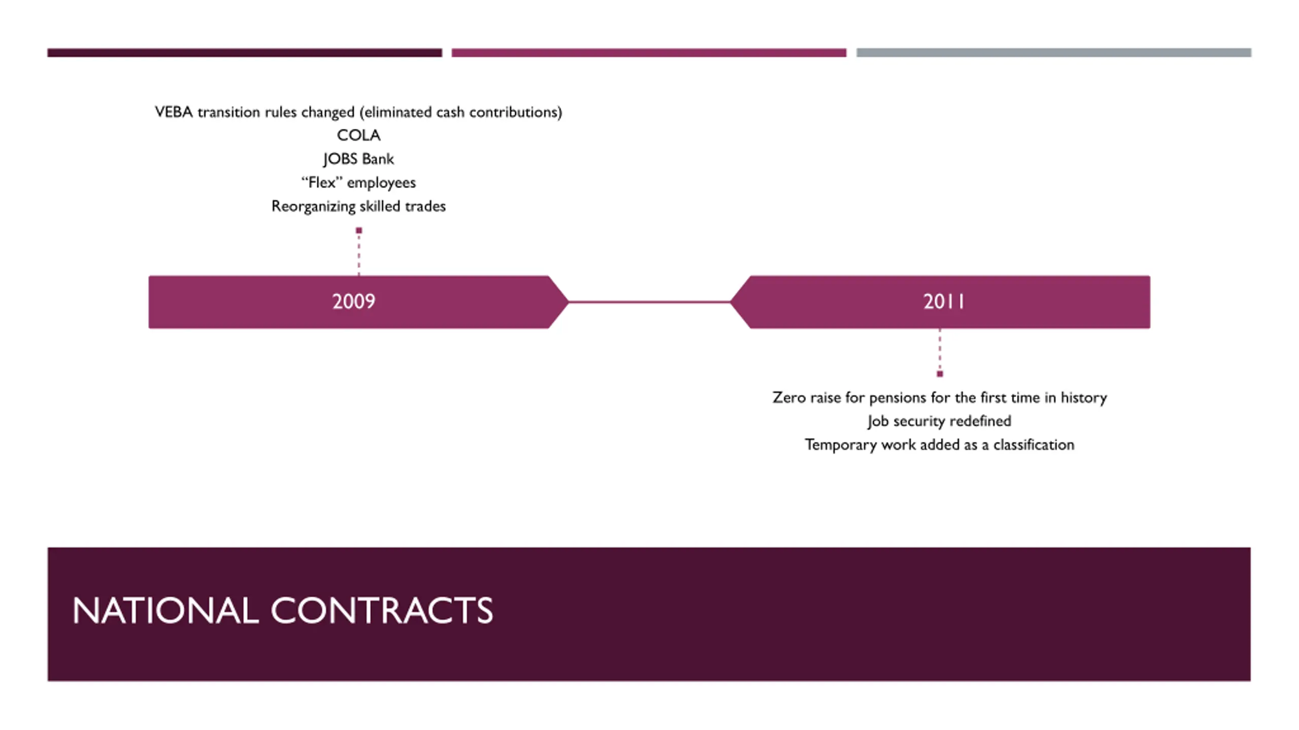 VEBA transition rules changed (eliminated cash contributions) COLA JOBS Bank Flex employees Reorganizing skilled trades 2009 2011 Zero raise for pensions for the first time in history Job security redefined Temporary work added as a classification NATIONAL CONTRACTS