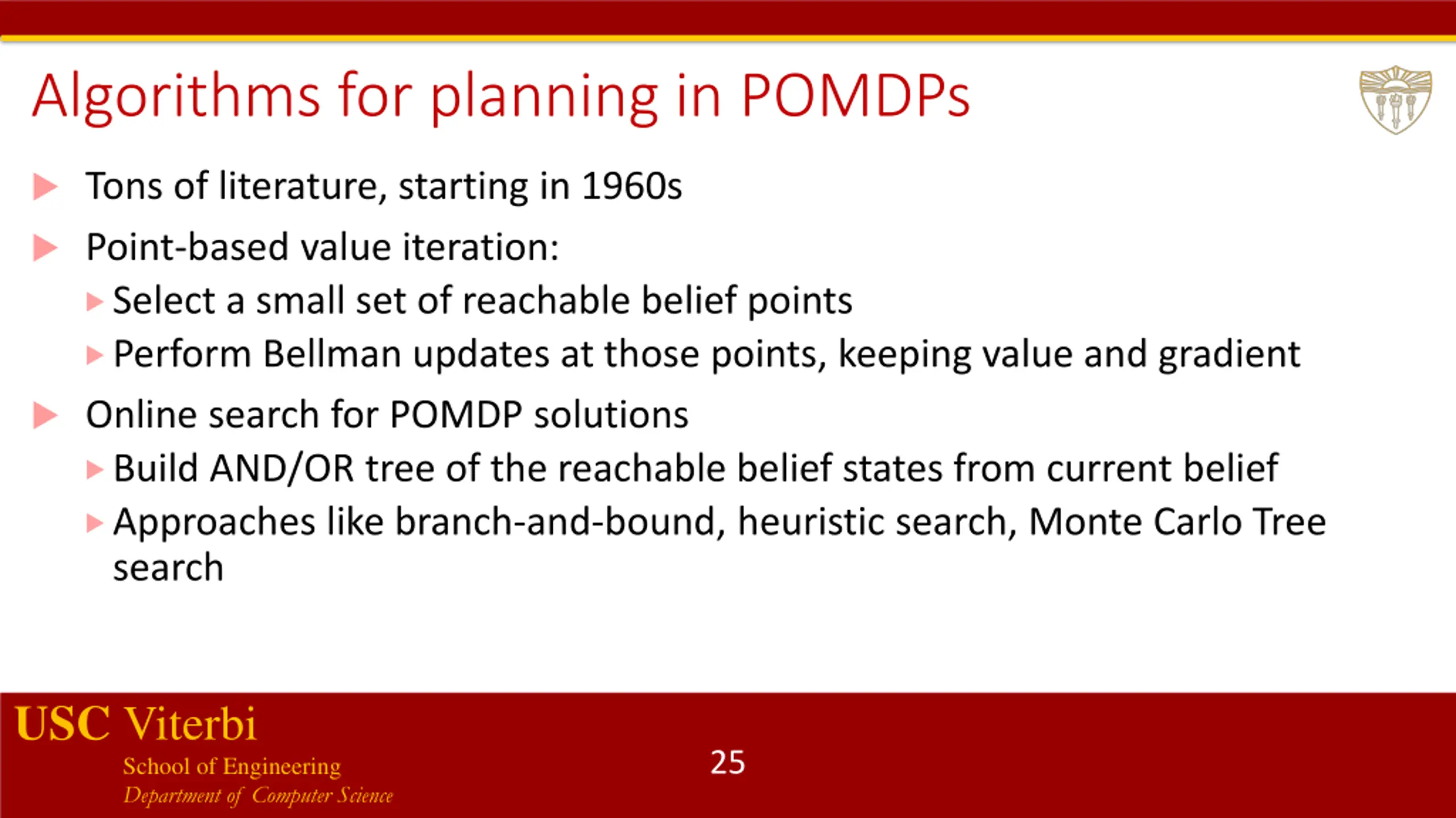 Algorithms for planning in POMDPs Tons of literature, starting in 1960s Point-based value iteration: Select a small set of reachable belief points Perform Bellman updates at those points, keeping value and gradient Online search for POMDP solutions Build AND/OR tree of the reachable belief states from current belief Approaches like branch-and-bound, heuristic search, Monte Carlo Tree search USC Viterbi School of Engineering Department of Computer Science 25