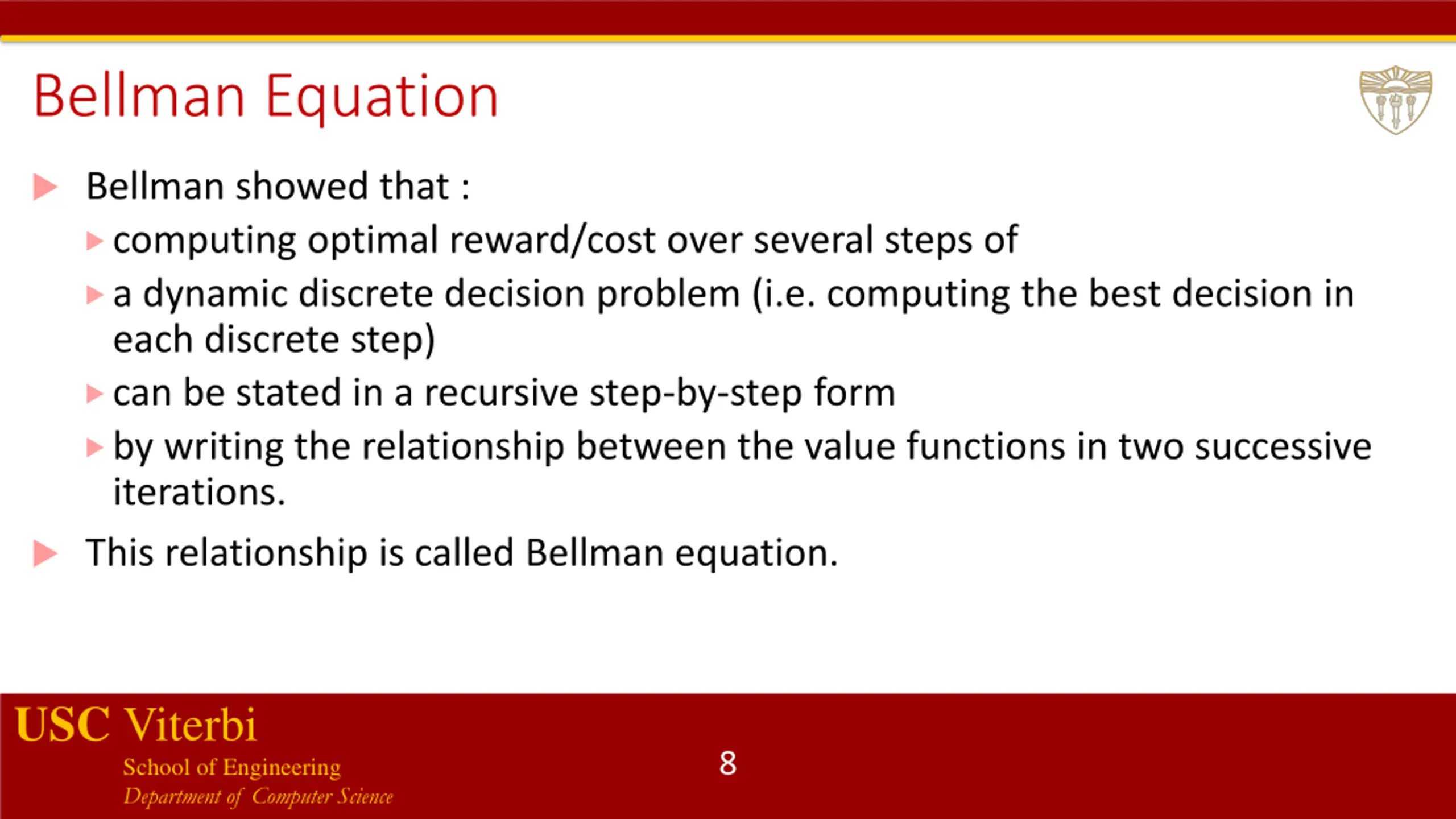 Bellman Equation Bellman showed that : computing optimal reward/cost over several steps of a dynamic discrete decision problem (i.e. computing the best decision in each discrete step) can be stated in a recursive step-by-step form by writing the relationship between the value functions in two successive iterations. This relationship is called Bellman equation. USC Viterbi School of Engineering Department of Computer Science 8