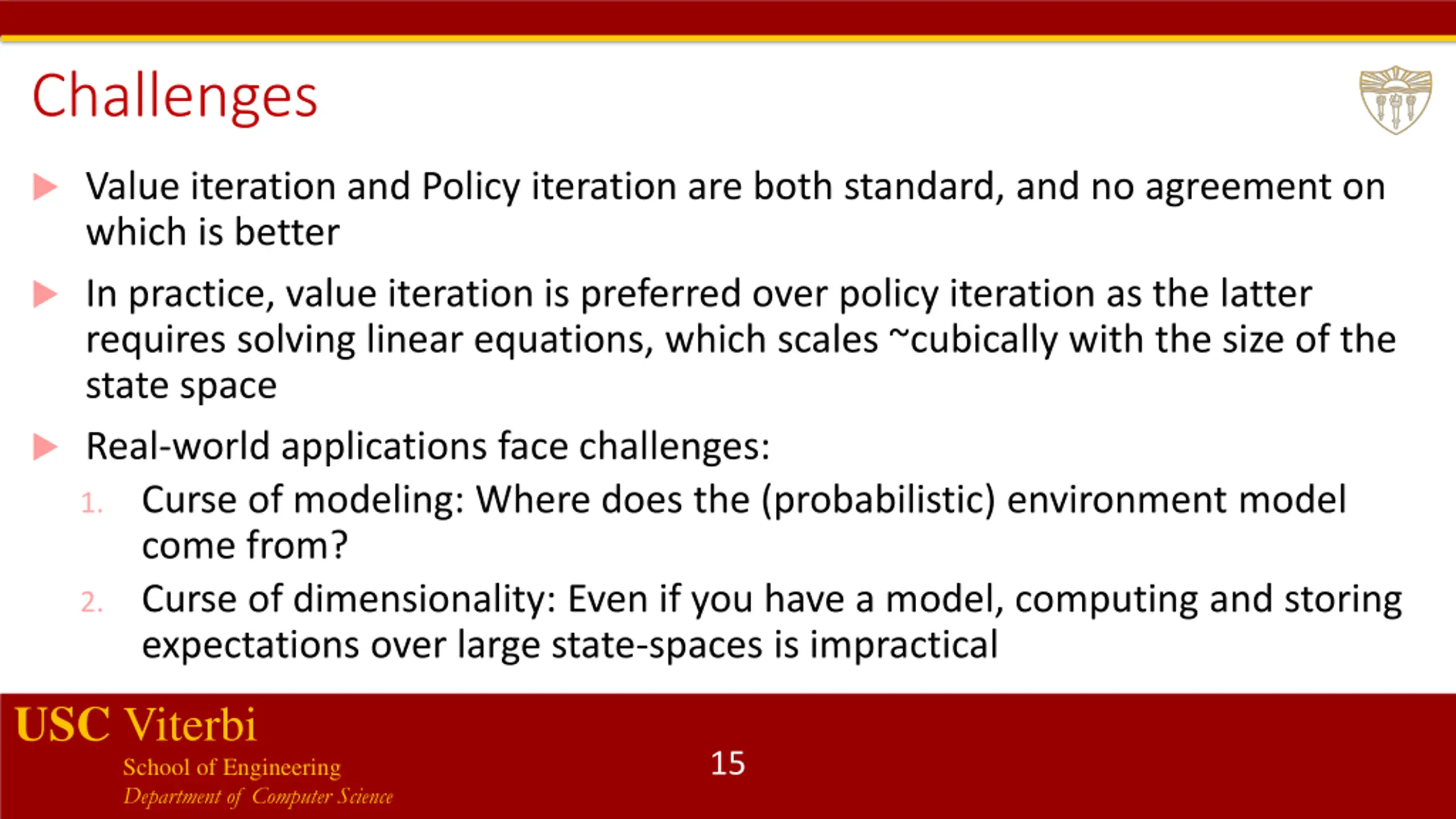 Challenges Value iteration and Policy iteration are both standard, and no agreement on which is better In practice, value iteration is preferred over policy iteration as the latter requires solving linear equations, which scales ~cubically with the size of the state space Real-world applications face challenges: 1. Curse of modeling: Where does the (probabilistic) environment model come from? 2. Curse of dimensionality: Even if you have a model, computing and storing expectations over large state-spaces is impractical USC Viterbi School of Engineering Department of Computer Science 15