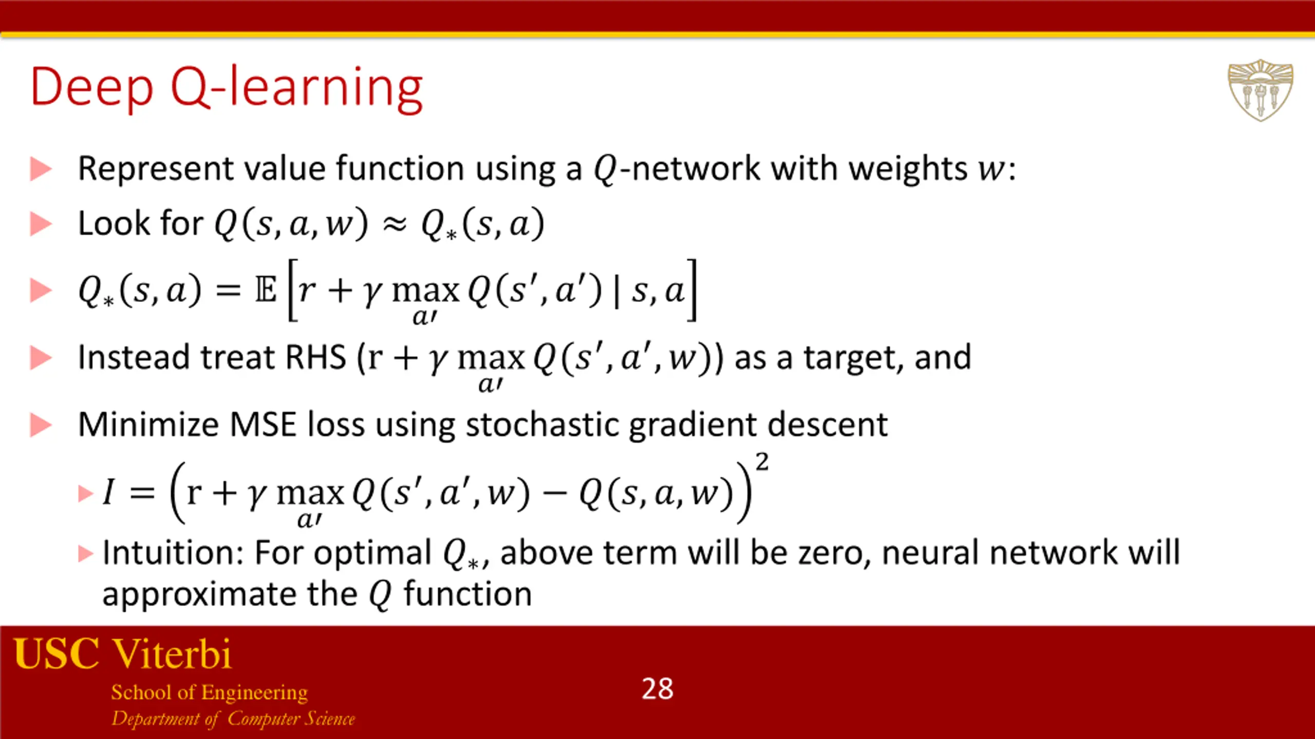 Deep Q-learning Represent value function using a ?-network with weights ?: Look for ? ?,?,? ? ?,? ? ? ,? | ?,? ? ?,? = ? ? + ?max ? ?(? ,? ,?)) as a target, and Instead treat RHS (r + ?max ? Minimize MSE loss using stochastic gradient descent 2 ?(? ,? ,?) ?(?,?,?) ? = r + ?max ? Intuition: For optimal ? , above term will be zero, neural network will approximate the ? function USC Viterbi School of Engineering Department of Computer Science 28