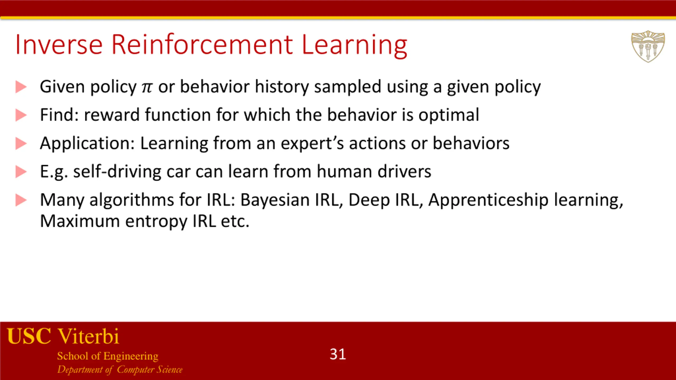 Inverse Reinforcement Learning Given policy ? or behavior history sampled using a given policy Find: reward function for which the behavior is optimal Application: Learning from an expert s actions or behaviors E.g. self-driving car can learn from human drivers Many algorithms for IRL: Bayesian IRL, Deep IRL, Apprenticeship learning, Maximum entropy IRL etc. USC Viterbi School of Engineering Department of Computer Science 31