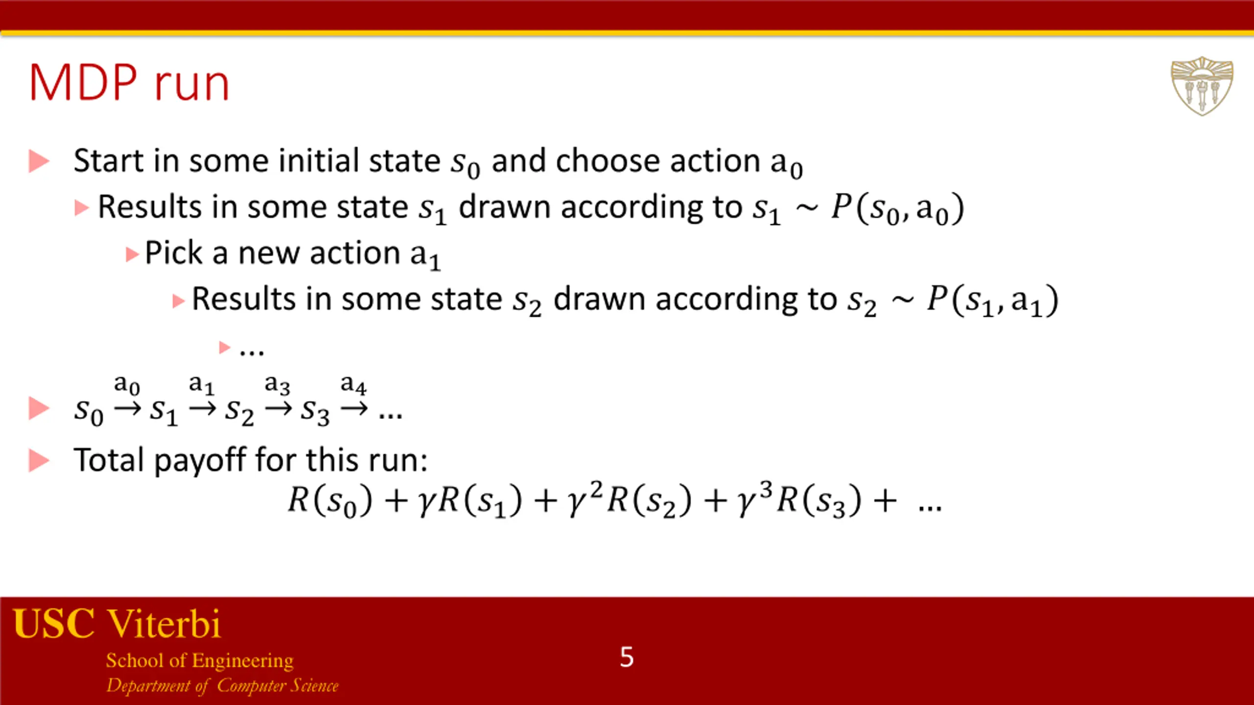 MDP run Start in some initial state ?0 and choose action a0 Results in some state ?1 drawn according to ?1 ?(?0,a0) Pick a new action a1 Results in some state ?2 drawn according to ?2 ?(?1,a1) ... a0?1 Total payoff for this run: ? ?0 + ?? ?1 + ?2? ?2 + ?3? ?3 + a1?2 a3?3 a4 ?0 USC Viterbi School of Engineering Department of Computer Science 5
