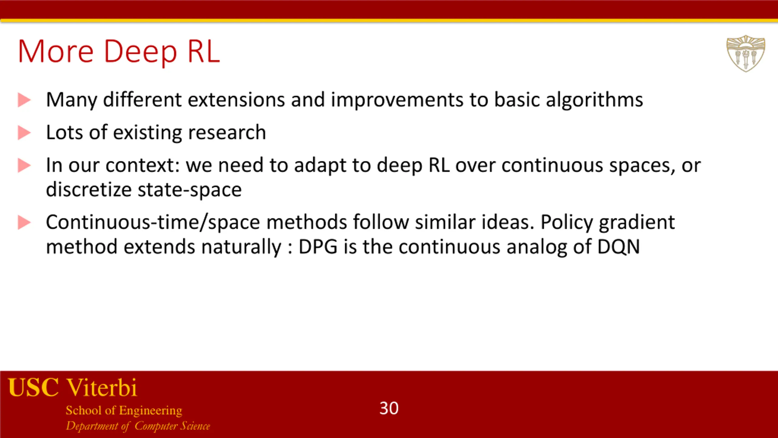 More Deep RL Many different extensions and improvements to basic algorithms Lots of existing research In our context: we need to adapt to deep RL over continuous spaces, or discretize state-space Continuous-time/space methods follow similar ideas. Policy gradient method extends naturally : DPG is the continuous analog of DQN USC Viterbi School of Engineering Department of Computer Science 30