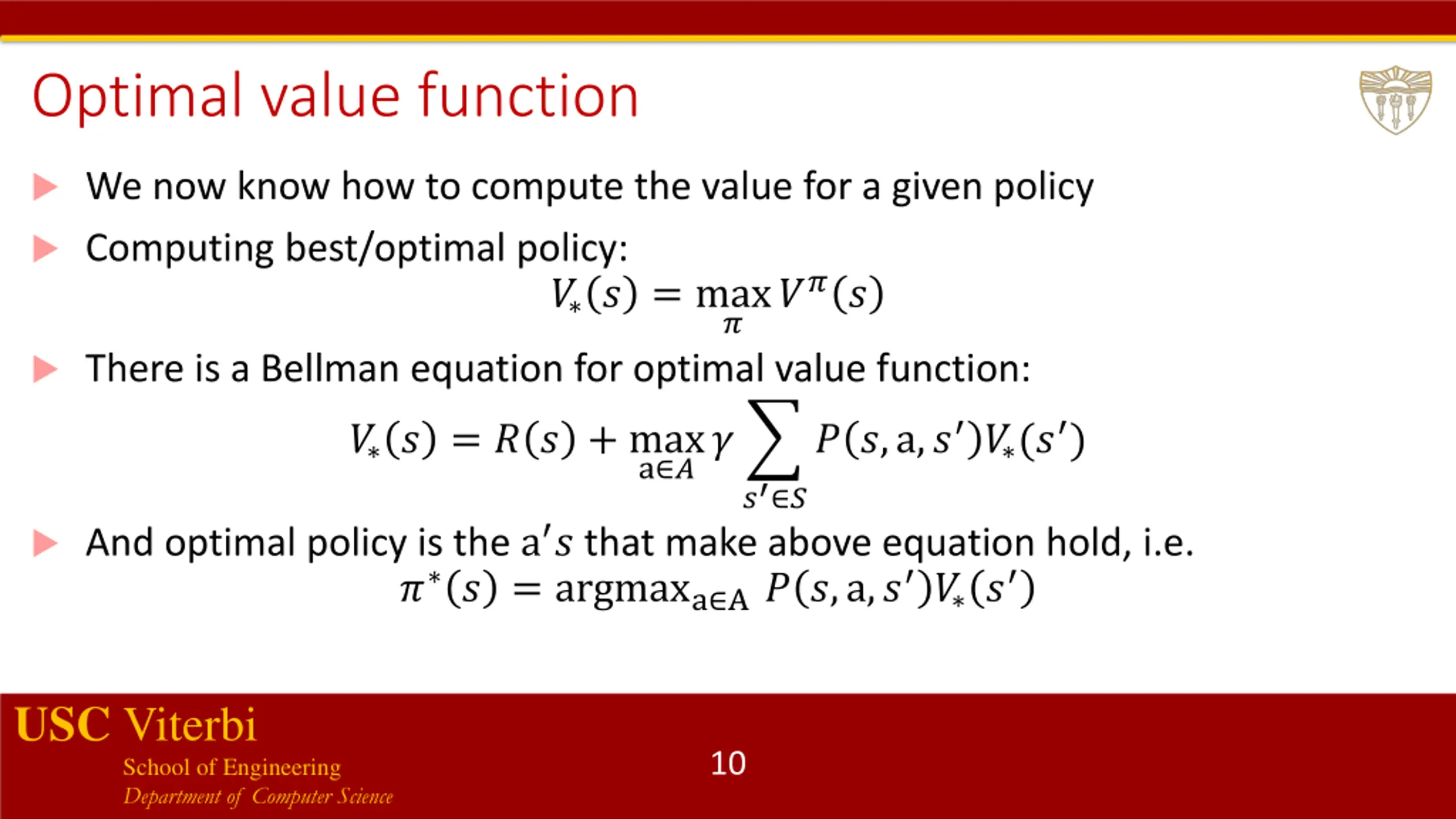 Value function satisfies Bellman equations ??? = ? ? + ? ? ? ?,? ? ,? ??(? ) I.e. expected sum of rewards starting from ? has two terms: Immediate reward ?(?) Expected sum of future discounted rewards Note that above is the same as: ??? = ? ? + ?? ? ?,? ? ??(? ) For a finite-state MDP, we can write one such equation for each ?, which gives us ? linear equations in ? variables (the unknown ??(?) for each ?). This can be solved efficiently (Gaussian elimination). USC Viterbi School of Engineering Department of Computer Science 9