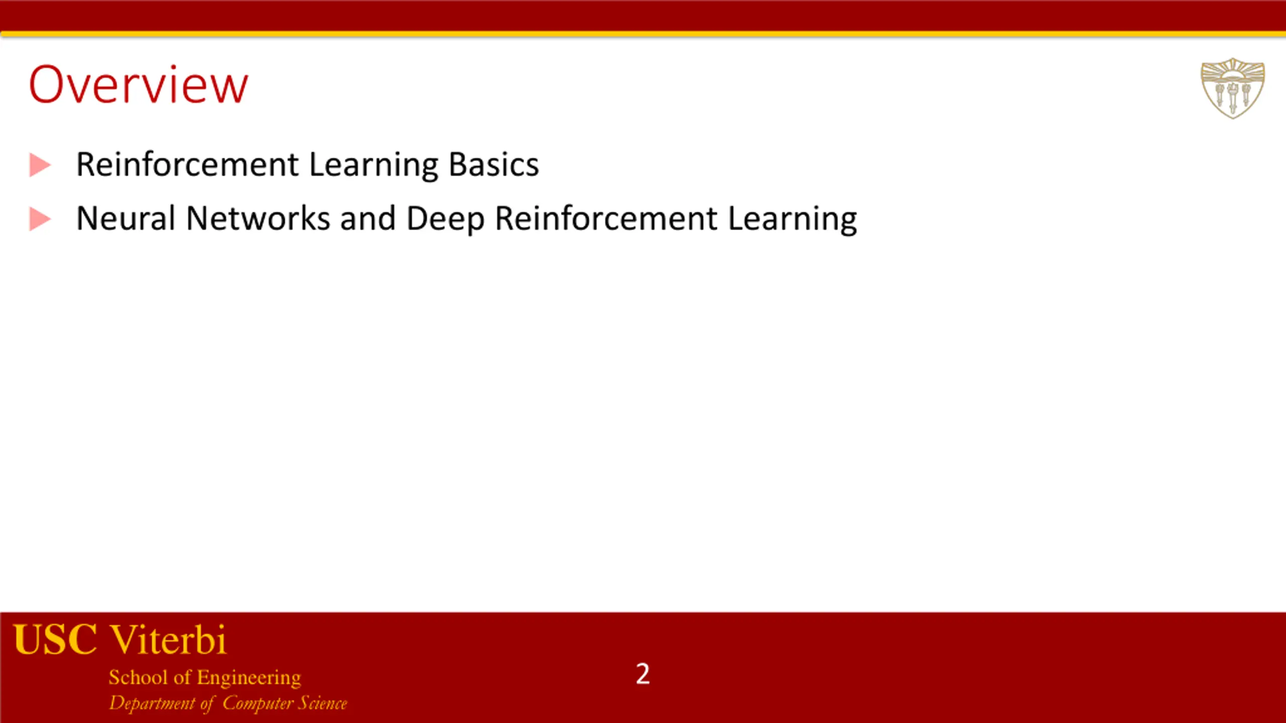 Overview Reinforcement Learning Basics Neural Networks and Deep Reinforcement Learning USC Viterbi School of Engineering Department of Computer Science 2