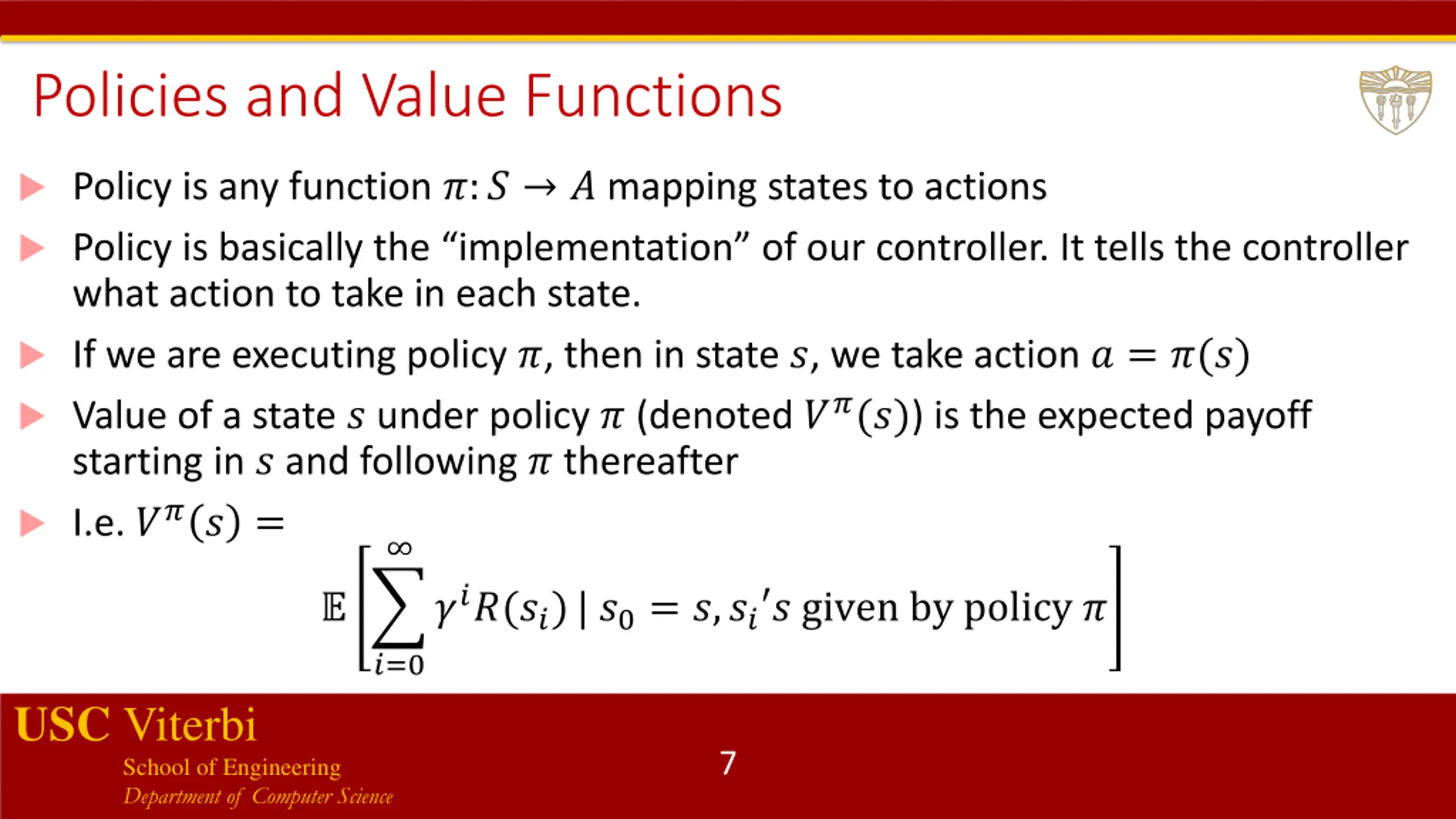 MDP as two-player game System starts in some initial state ?0 and player 1 (controller) chooses action a0 Results in player 2 (environment) picking state ?1 according to ?1 ?(?0,a0) Player 1 picks a new action a1 Player 2 picks state ?2 drawn according to ?2 ?(?1,a1) ... Total payoff for this run: ? ?0 + ?? ?1 + ?2? ?2 + ?3? ?3 + USC Viterbi School of Engineering Department of Computer Science 6