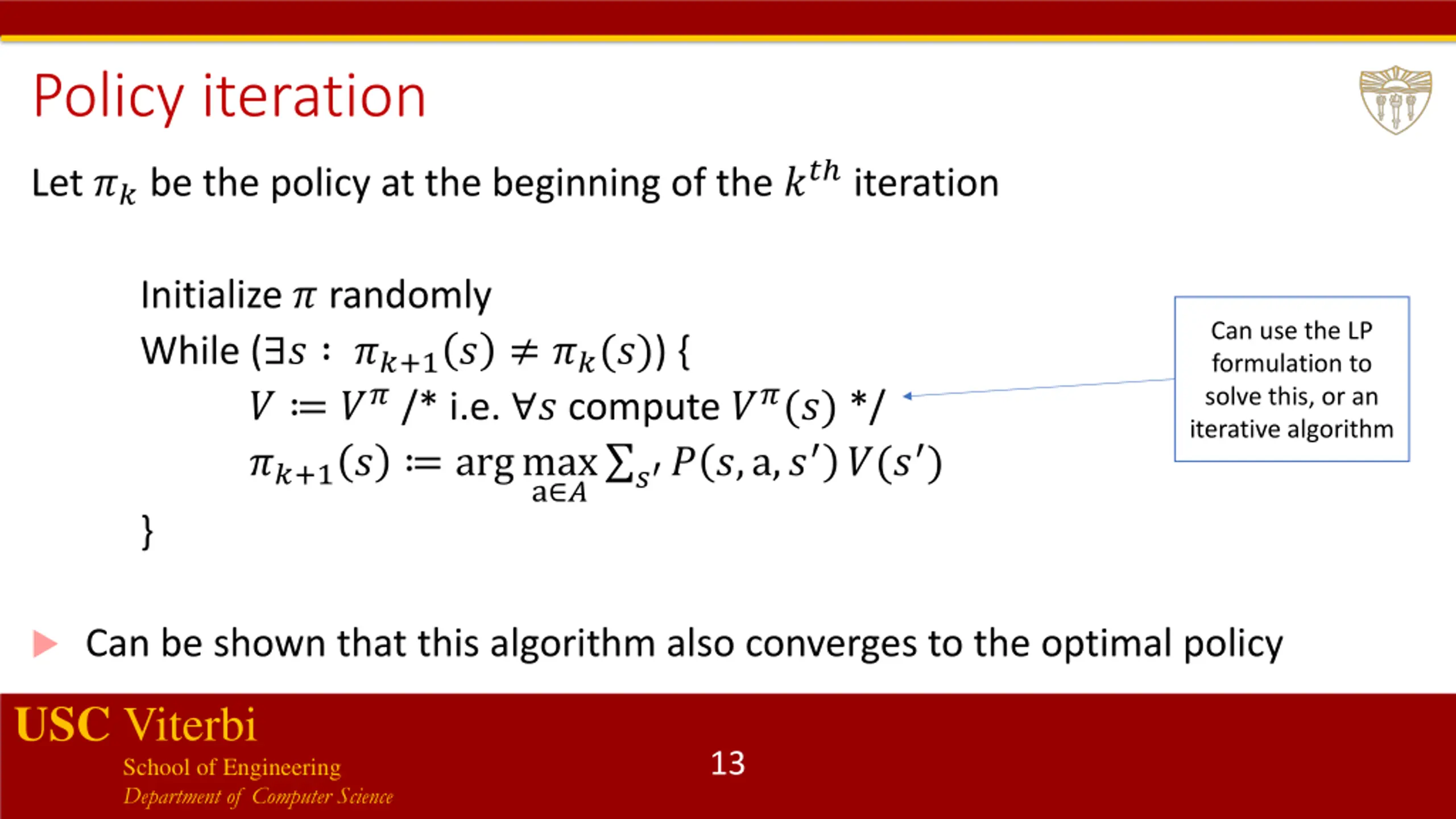 Value iteration ??(?) : Value of state ? at the beginning of the ?? iteration Initialize ? ? 0, ? ? While max ? ???+1? ??? ? { ? ?,a,? ??? ??+1? ? ? + max ? a ? ? } Can be shown that after finite number of iterations ? converges to ? USC Viterbi School of Engineering Department of Computer Science 12