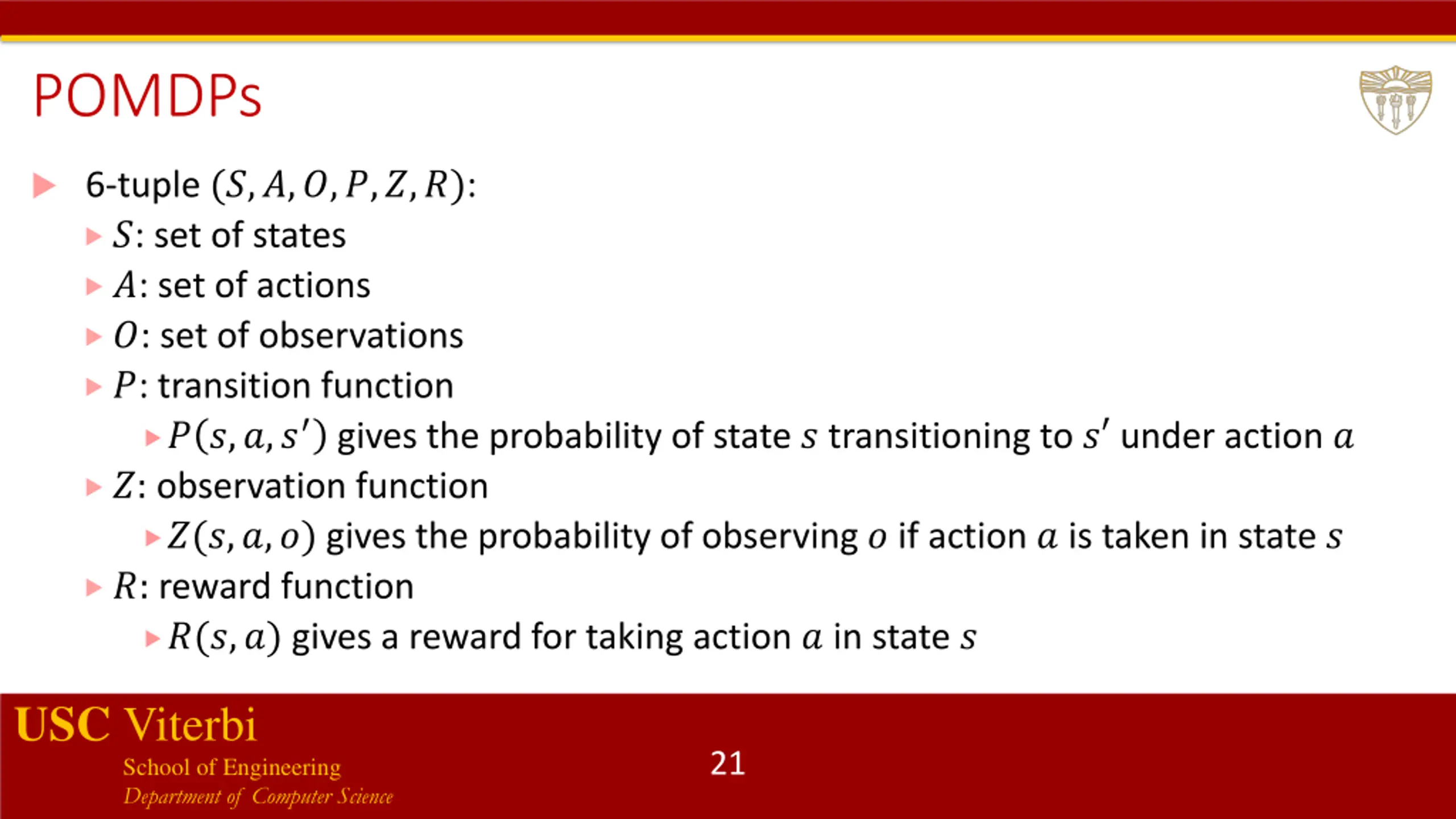 Some more challenges for RL in autonomous CPS Uncertainty! In all previous algorithms, we assume that all states are fully visible and precisely estimable In CPS examples, there is uncertainty in states (sensor/actuation noise, state may not be observable but only estimated, etc.) The approach is to model the underlying system as a Partially-Observable Markov Decision Process (POMDP) -- pronounced POM-DPs USC Viterbi School of Engineering Department of Computer Science 20