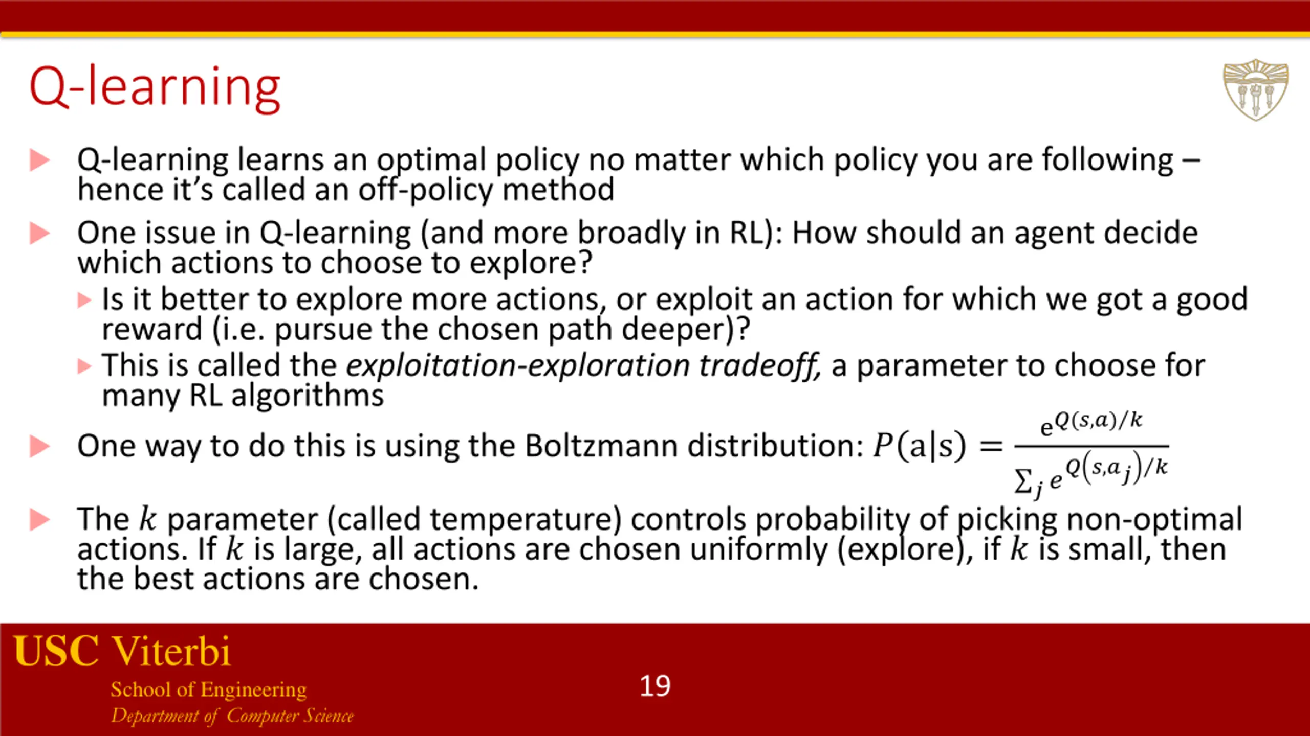 Q-learning Q-learning learns an optimal policy no matter which policy you are following hence it s called an off-policy method One issue in Q-learning (and more broadly in RL): How should an agent decide which actions to choose to explore? Is it better to explore more actions, or exploit an action for which we got a good reward (i.e. pursue the chosen path deeper)? This is called the exploitation-exploration tradeoff, a parameter to choose for many RL algorithms ?(?,?) ? e One way to do this is using the Boltzmann distribution: ? a s = ? ?,?? ? ?? The ? parameter (called temperature) controls probability of picking non-optimal actions. If ? is large, all actions are chosen uniformly (explore), if ? is small, then the best actions are chosen. USC Viterbi School of Engineering Department of Computer Science 19