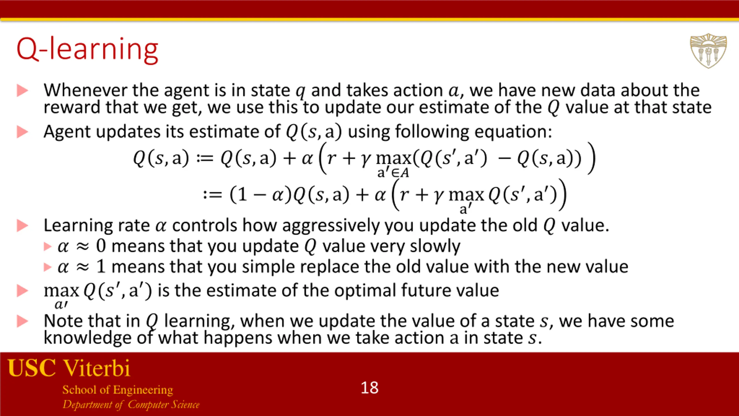 Q-learning: (Model-free method) Called a model-free method, because it does not assume knowledge of a model of the environment Learning agent tries to learn optimal policy from its history of interactions with the environment Agent interaction described in tuples called experience (?,a,?,? ) Recall that function ? for each state and action returns the expected reward of that action (and all subsequent actions) at that state Q-learning uses a technique called temporal differences to estimate optimal value ? in each state Agent maintains a table of ? values for each state ? and action a USC Viterbi School of Engineering Department of Computer Science 17