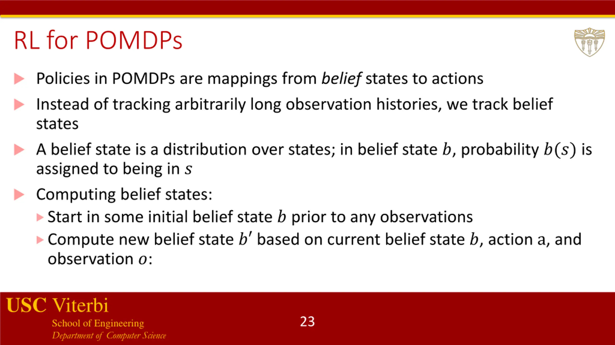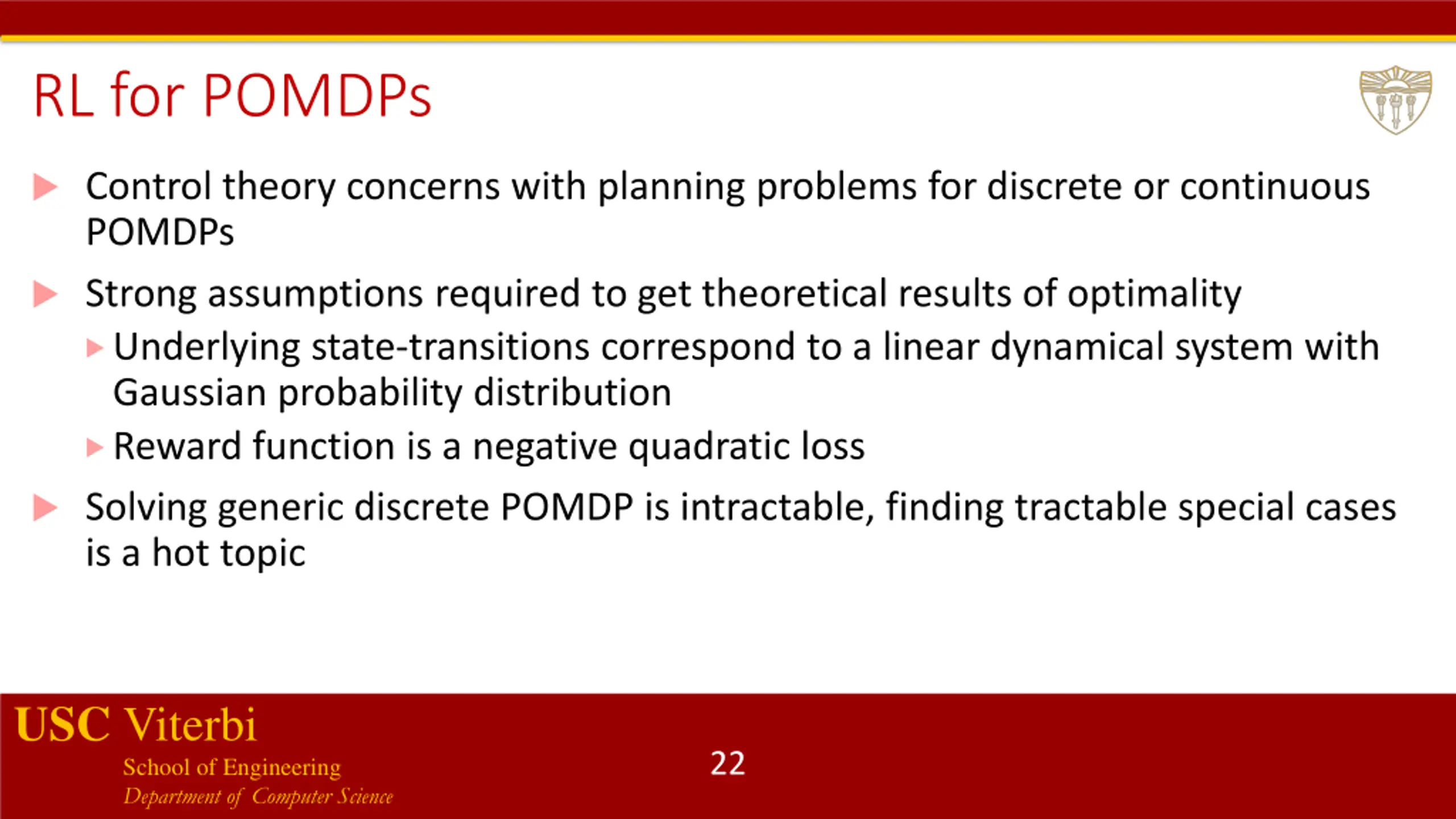 RL for POMDPs Control theory concerns with planning problems for discrete or continuous POMDPs Strong assumptions required to get theoretical results of optimality Underlying state-transitions correspond to a linear dynamical system with Gaussian probability distribution Reward function is a negative quadratic loss Solving generic discrete POMDP is intractable, finding tractable special cases is a hot topic USC Viterbi School of Engineering Department of Computer Science 22