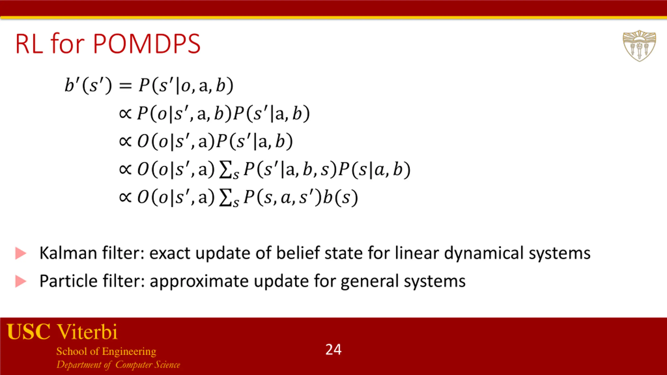 RL for POMDPs Policies in POMDPs are mappings from belief states to actions Instead of tracking arbitrarily long observation histories, we track belief states A belief state is a distribution over states; in belief state ?, probability ?(?) is assigned to being in ? Computing belief states: Start in some initial belief state ? prior to any observations Compute new belief state ? based on current belief state ?, action a, and observation ?: USC Viterbi School of Engineering Department of Computer Science 23