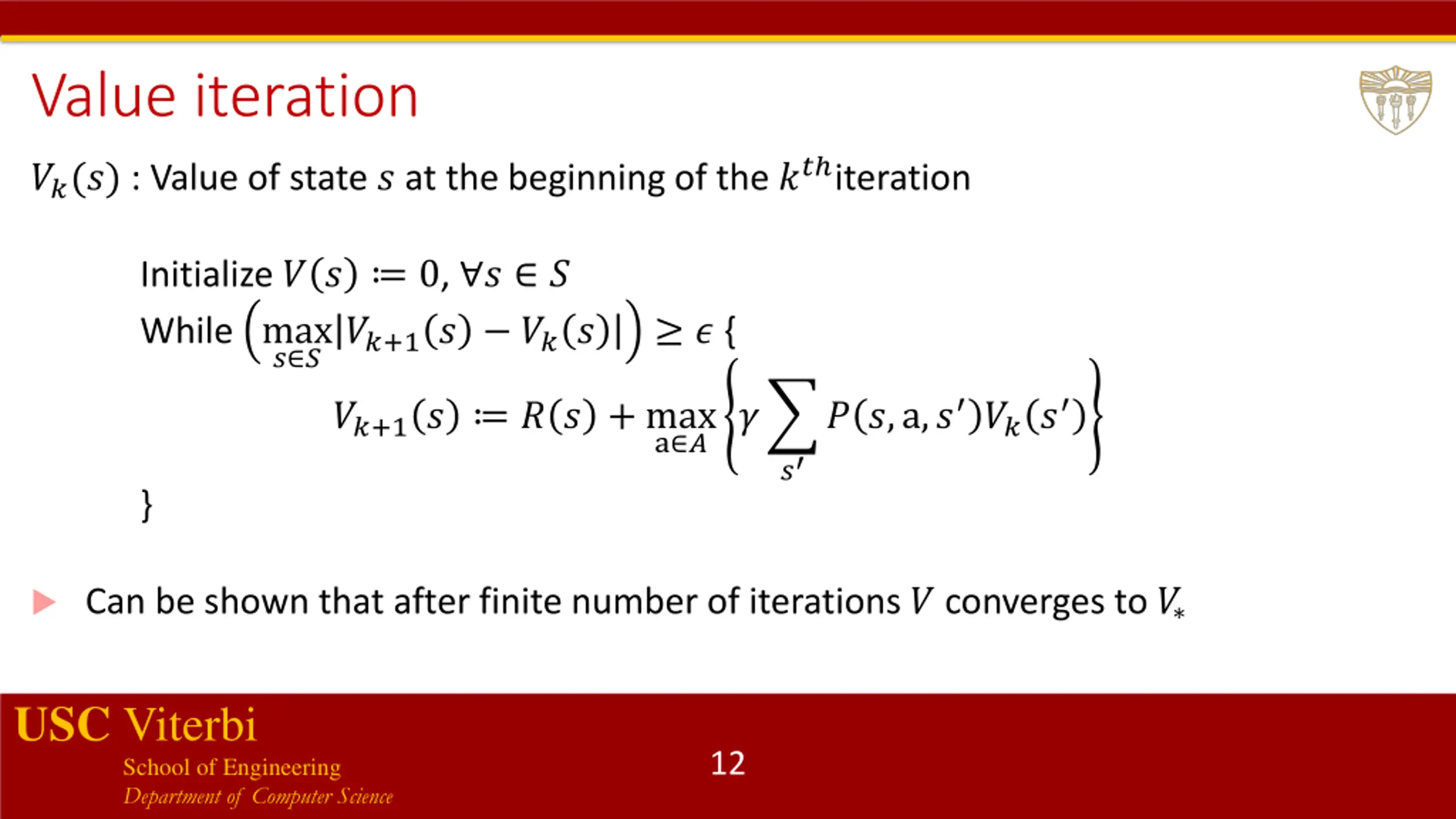 Planning in MDPs How do we compute the optimal policy? Two algorithms: Value iteration Policy iteration Value iteration: Repeatedly update estimated value function using Bellman equation Policy iteration: Use value function of a given policy to improve the policy USC Viterbi School of Engineering Department of Computer Science 11