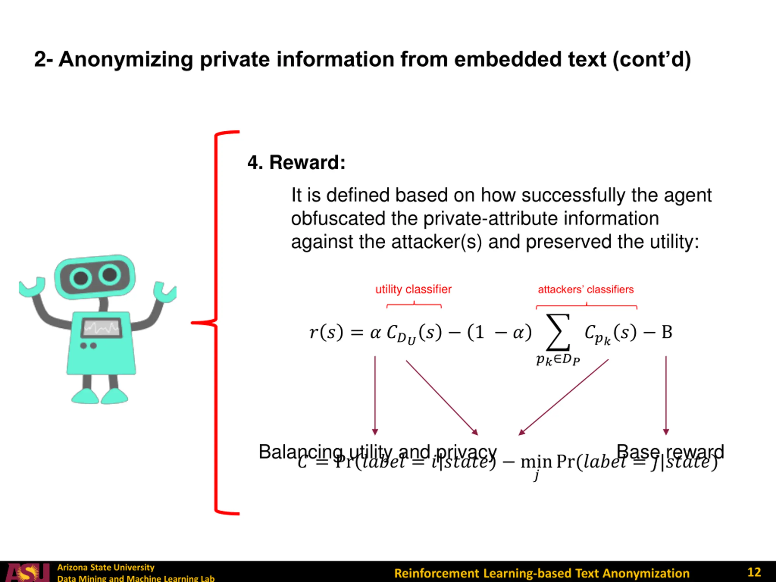 2- Anonymizing private information from embedded text (contd) 2. State: state is the current text embedding vector: 0.5 0.5 . 0.2 0.8 0.9 Arizona State University Data Mining and Machine Learning Lab 10 Reinforcement Learning-based Text Anonymization
