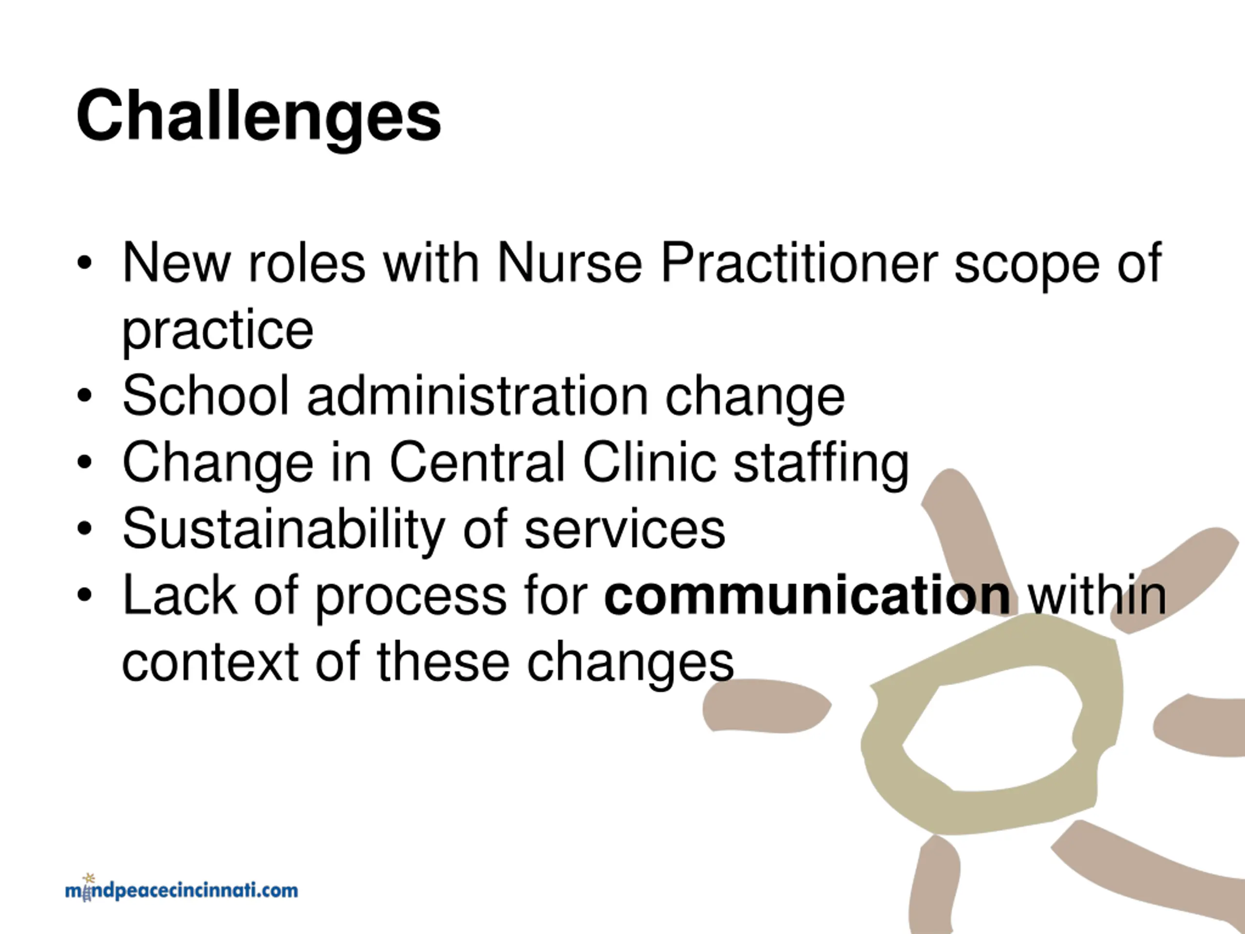 Challenges New roles with Nurse Practitioner scope of practice School administration change Change in Central Clinic staffing Sustainability of services Lack of process for communication within context of these changes