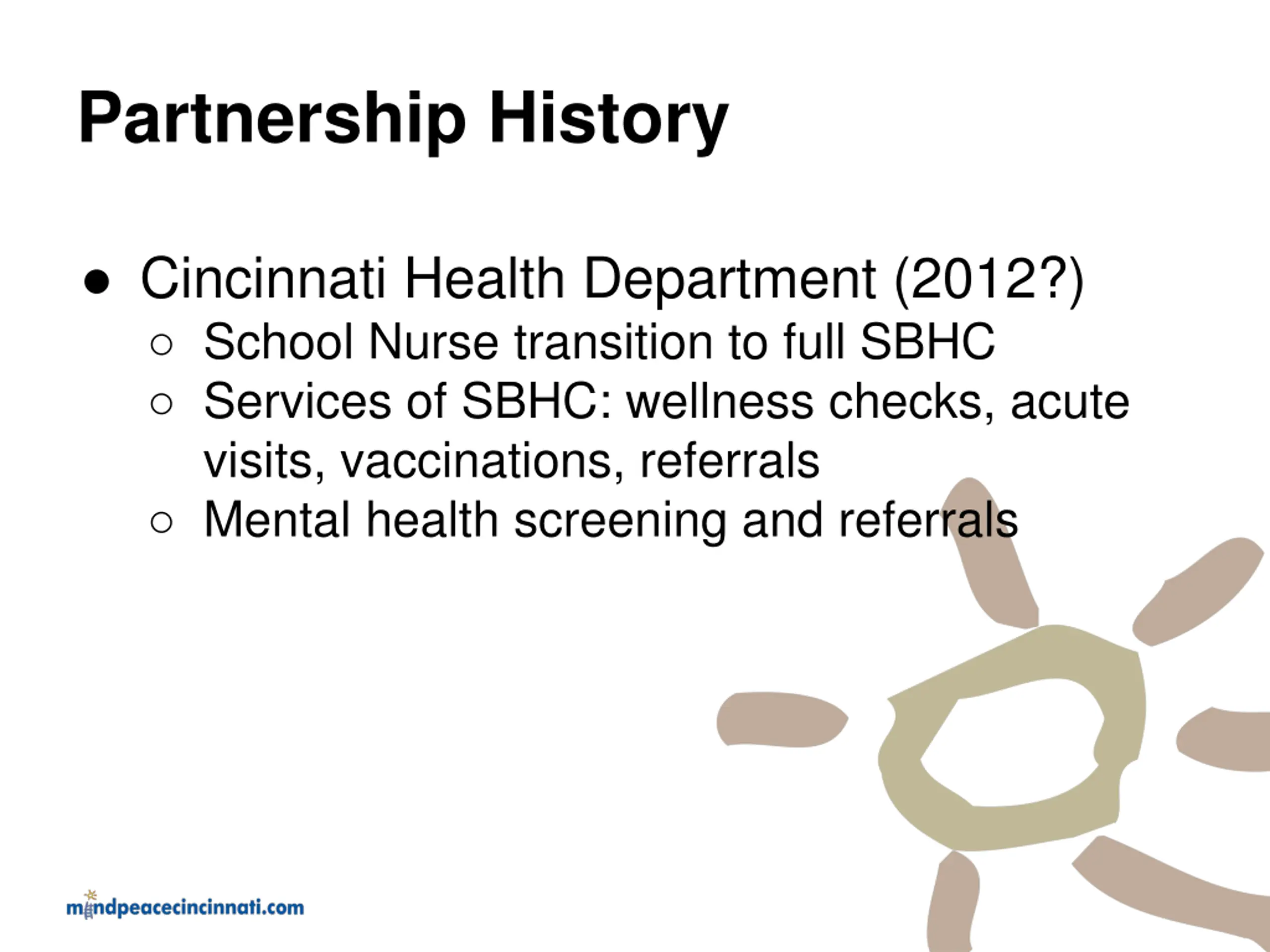Partnership History Cincinnati Health Department (2012?) School Nurse transition to full SBHC Services of SBHC: wellness checks, acute visits, vaccinations, referrals Mental health screening and referrals