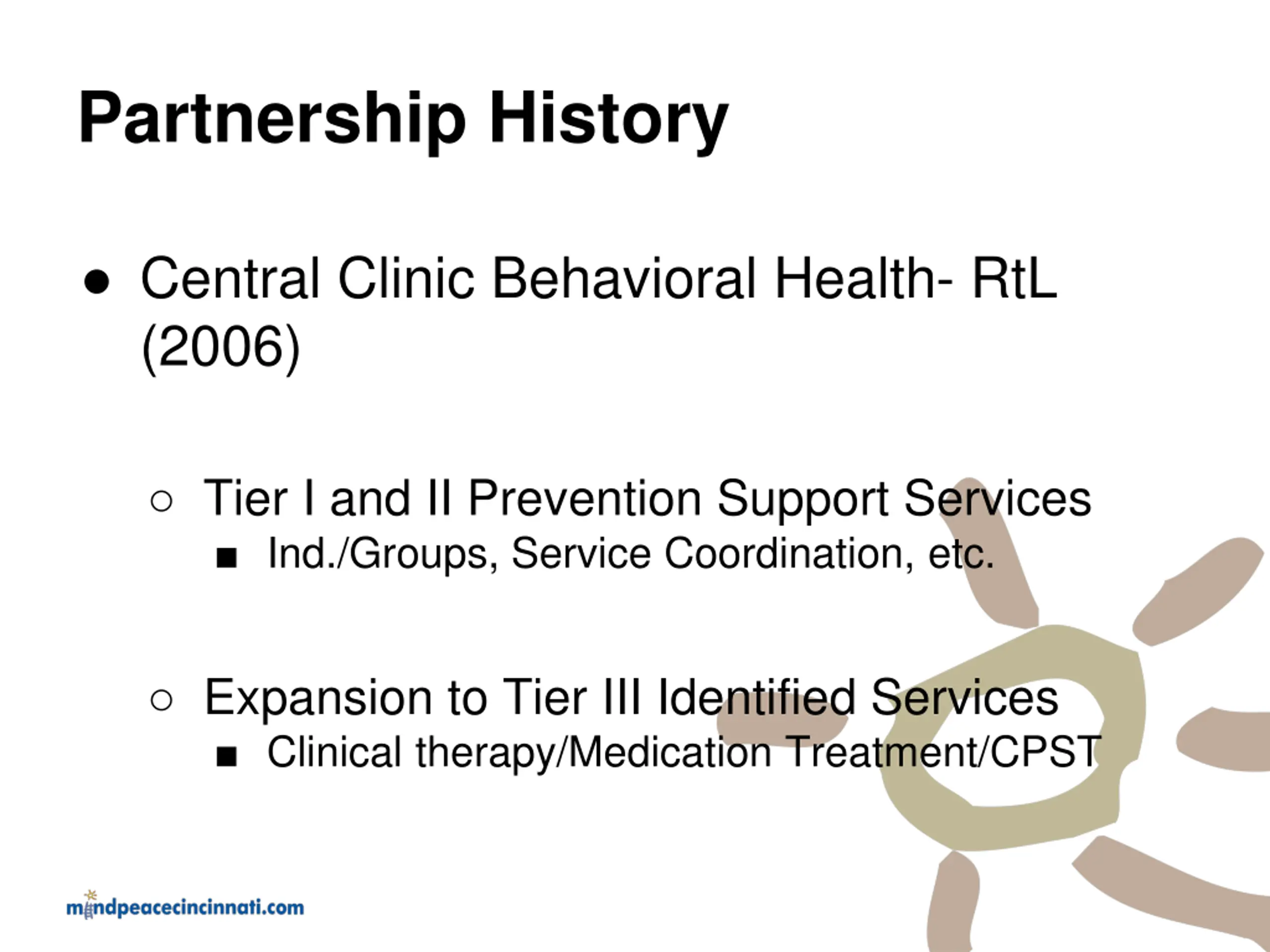 Partnership History Central Clinic Behavioral Health- RtL (2006) Tier I and II Prevention Support Services Ind./Groups, Service Coordination, etc. Expansion to Tier III Identified Services Clinical therapy/Medication Treatment/CPST