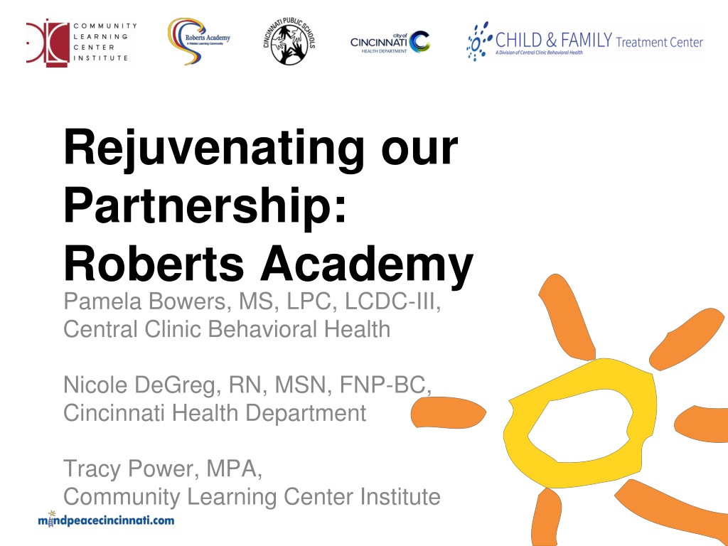Rejuvenating our Partnership: Roberts Academy Pamela Bowers, MS, LPC, LCDC-III, Central Clinic Behavioral Health Nicole DeGreg, RN, MSN, FNP-BC, Cincinnati Health Department Tracy Power, MPA, Community Learning Center Institute